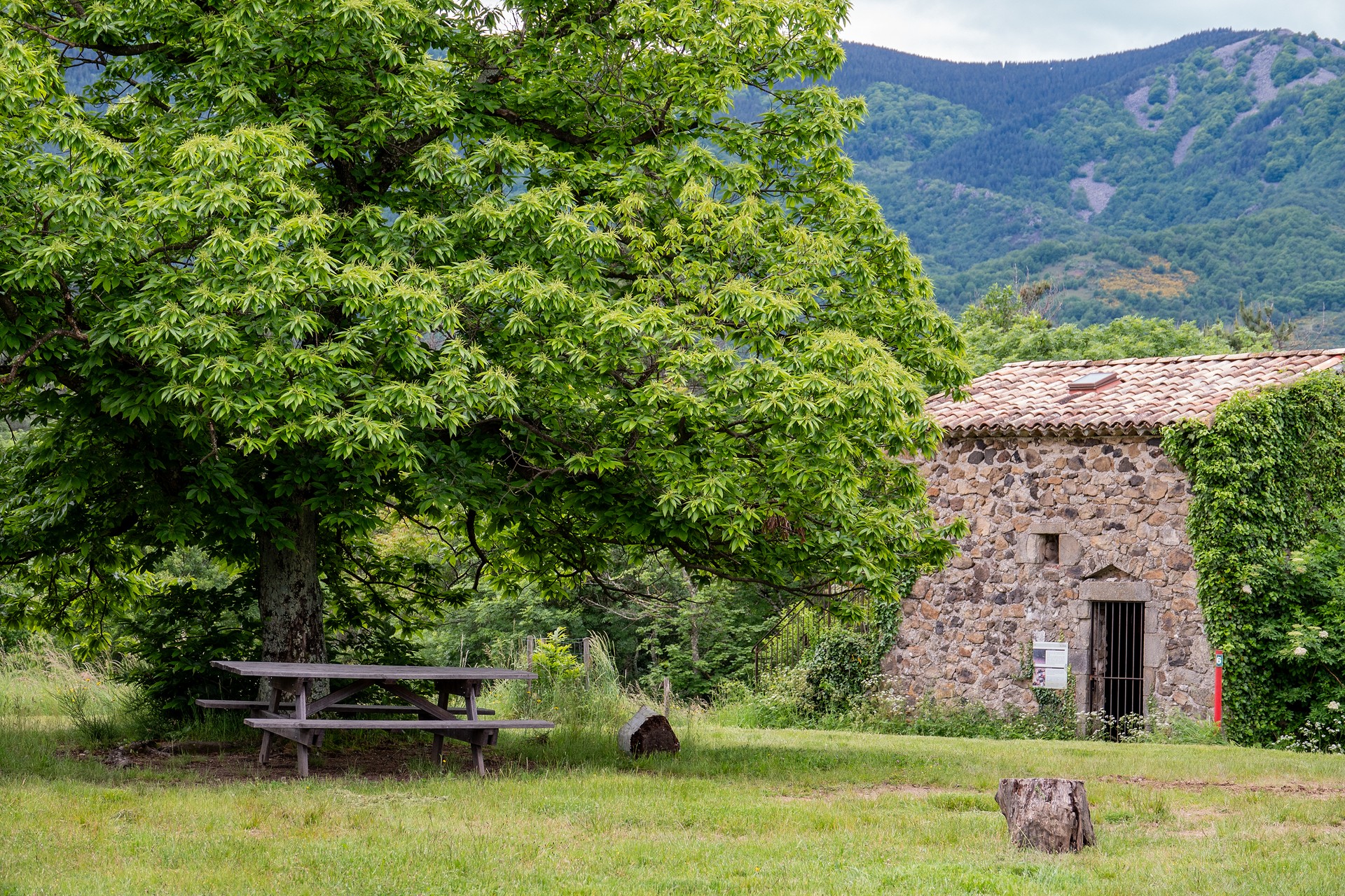 Aire de pique-nique se situant près de la Maison du Parc Naturel des Monts d'Ardèche au Domaine de Rochemure.