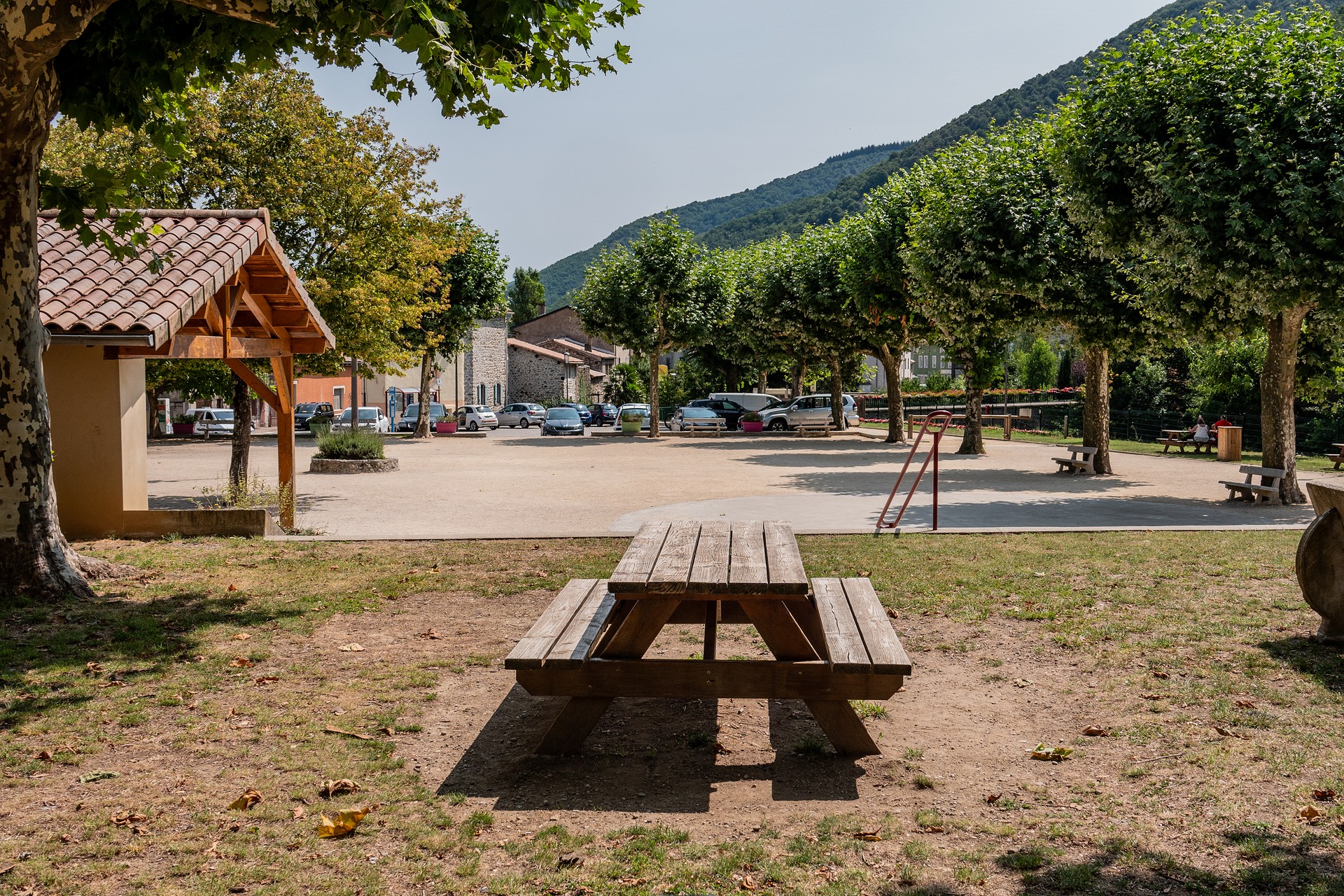 Aire de pique-nique se situant sur la place du Chambon dans le village de Mayres. 4 tables de pique-nique sont disponibles sur la place.
