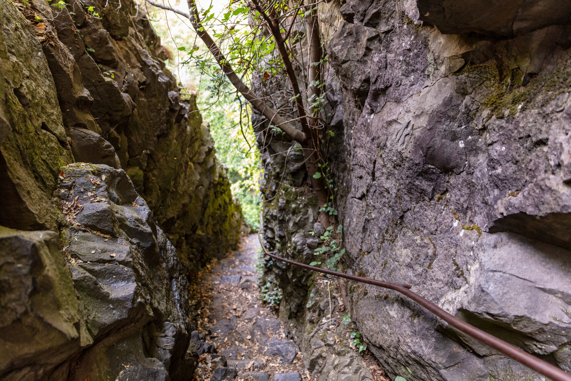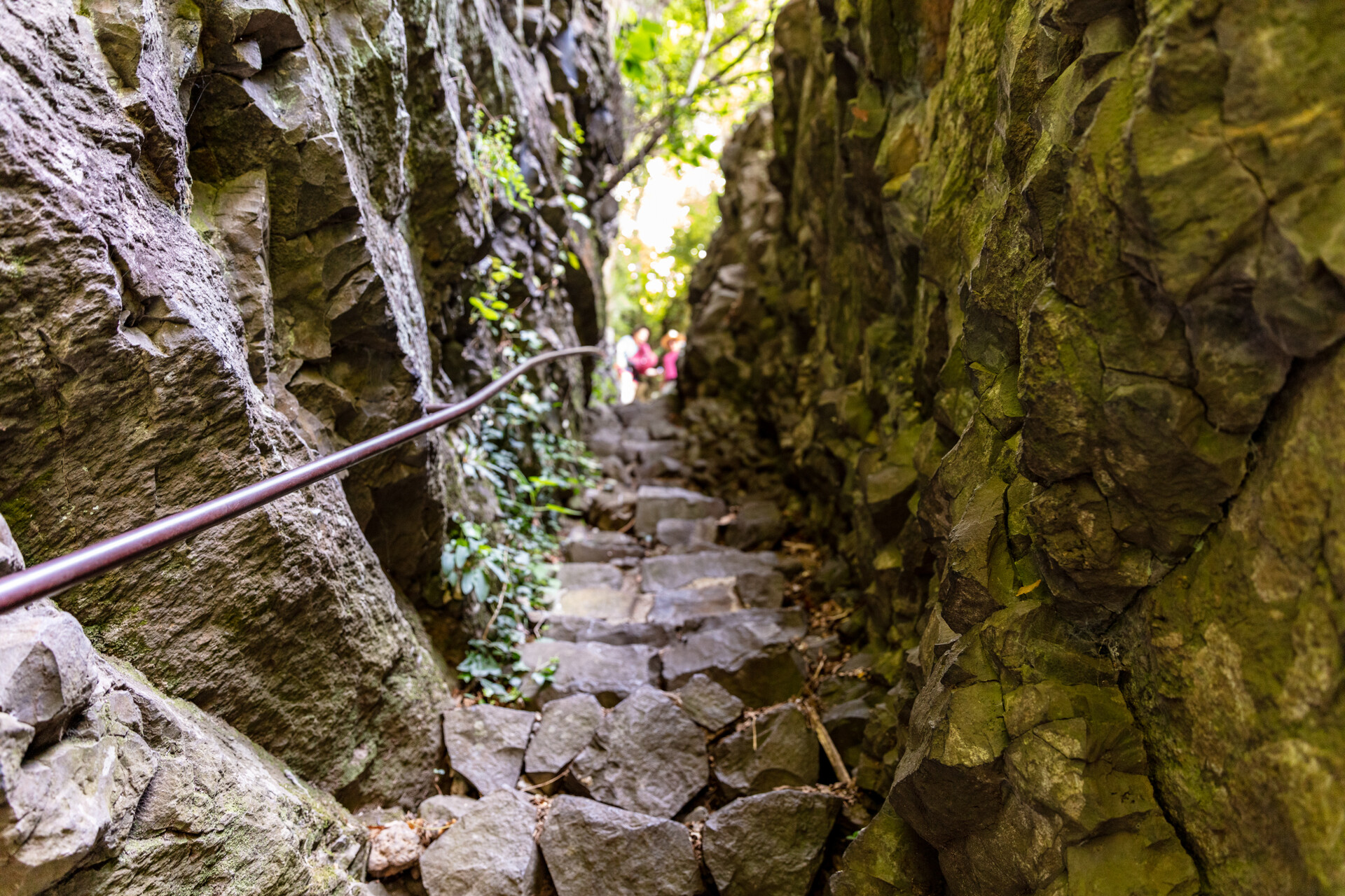 Le belvédère de l'Échelle du roi est situé après le stade de l'échelle du roi sur la droite, juste avant l'échelle du roi. Il permet d'observer cet escalier vertigineux directement taillé dans la roche volcanique et le site naturel du Pont du diable.