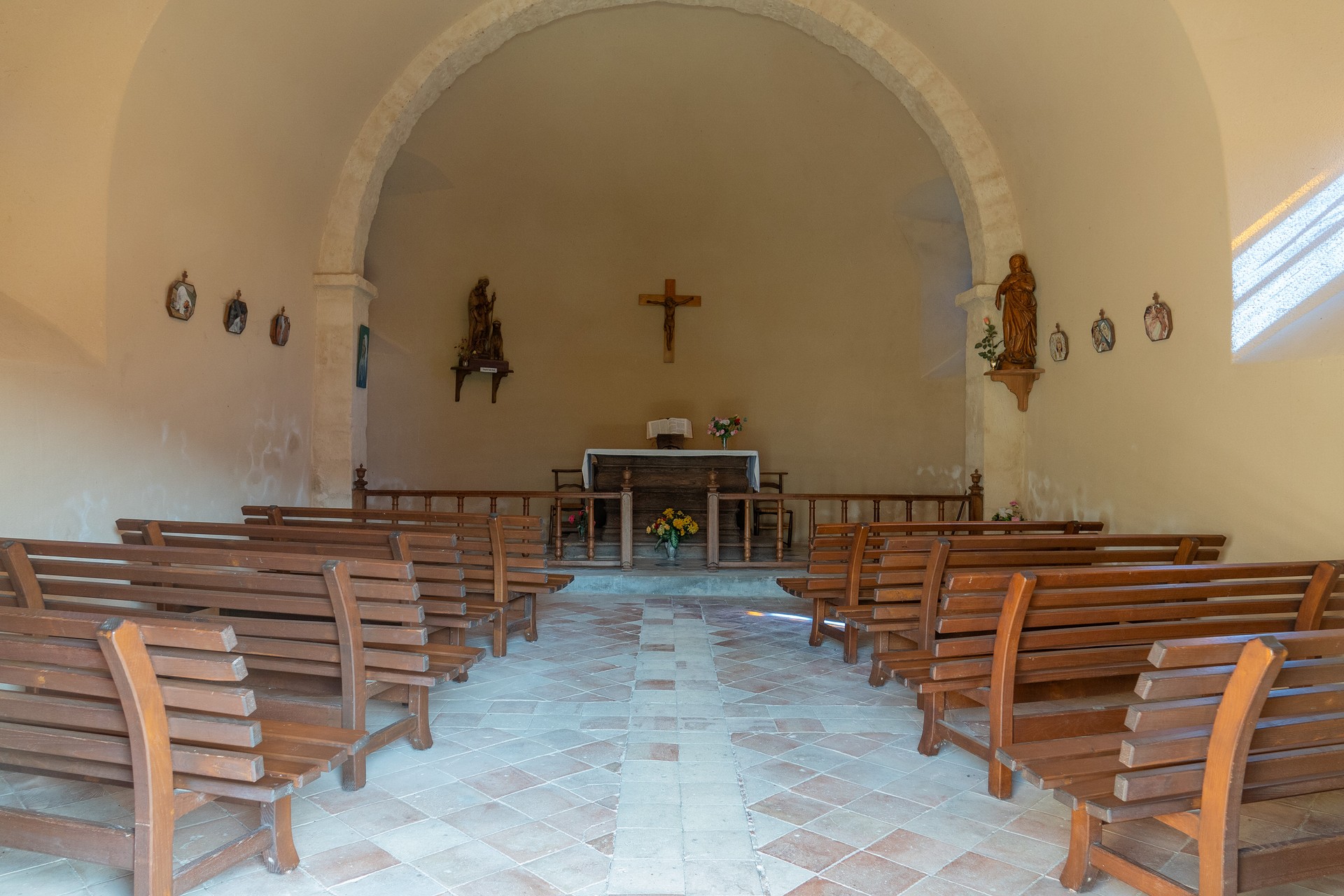 Caractéristiques de cette chapelle : longueur 12m, largeur 7m, hauteur 7m. Murs épais, petites fenêtres, abside romane. Bénitier de pierre sous une croix de pierre. Autel de bois ciré. Chemin de croix peint par un peintre albenassien Robert Petit-Lorraine.