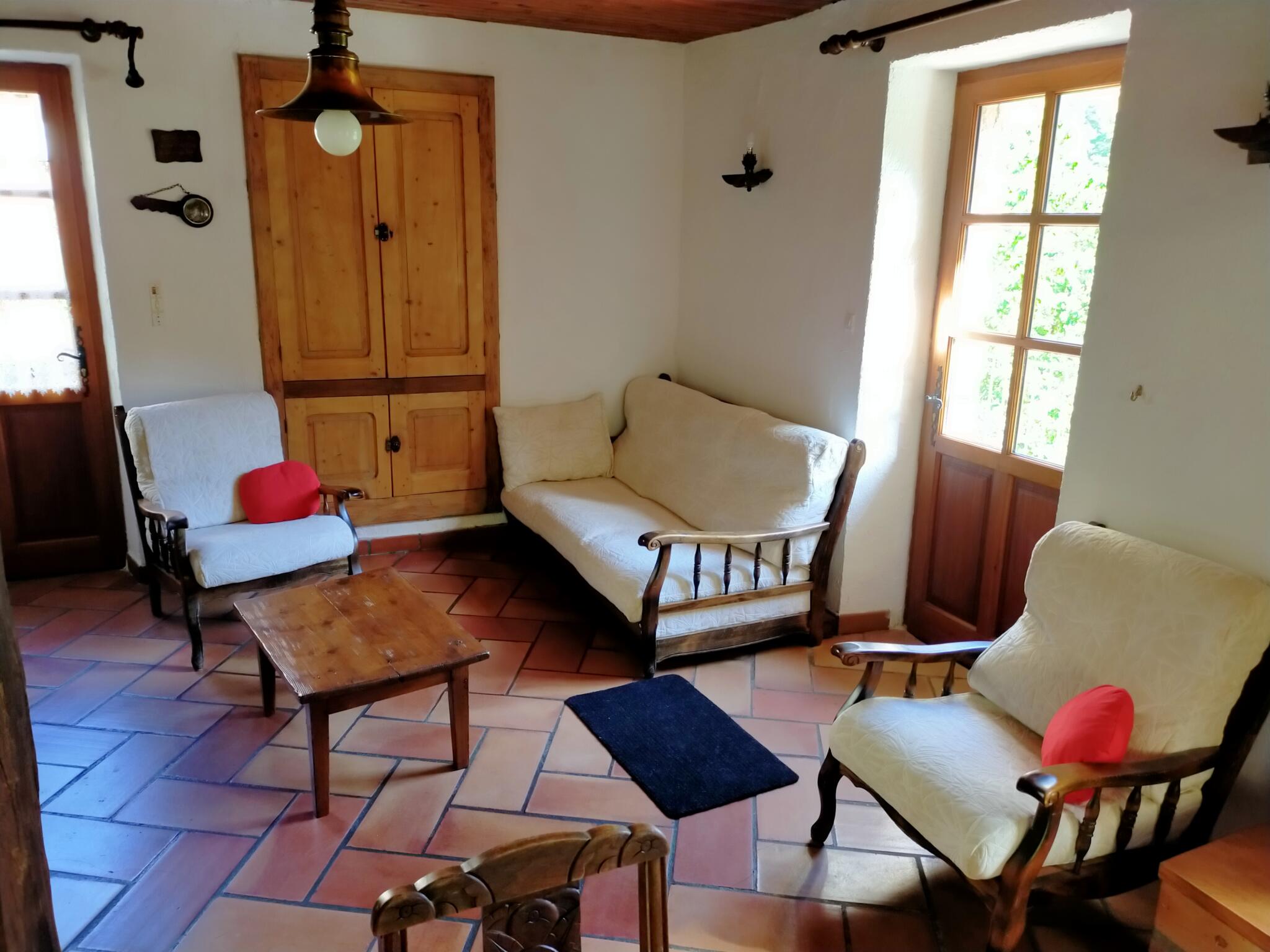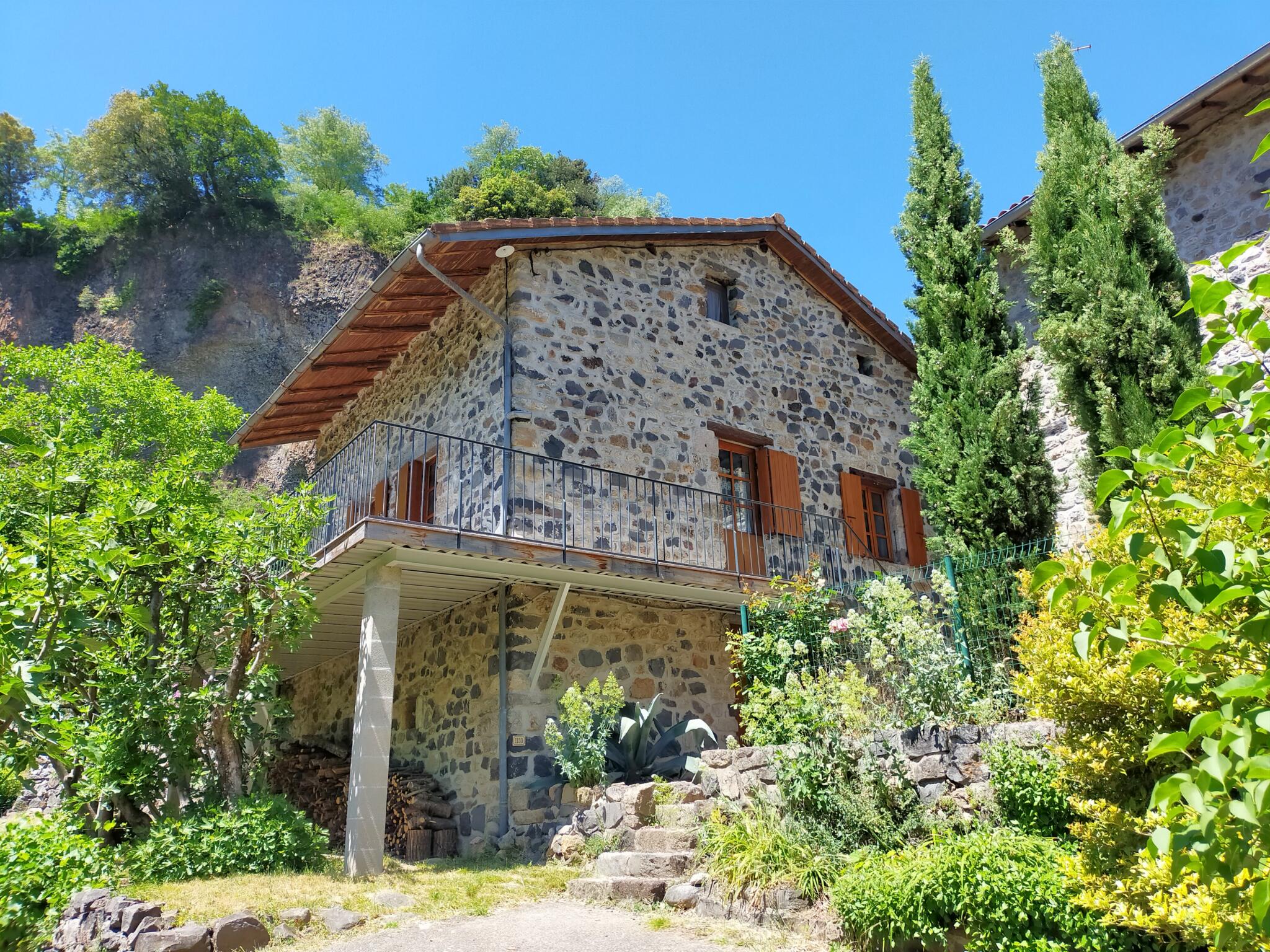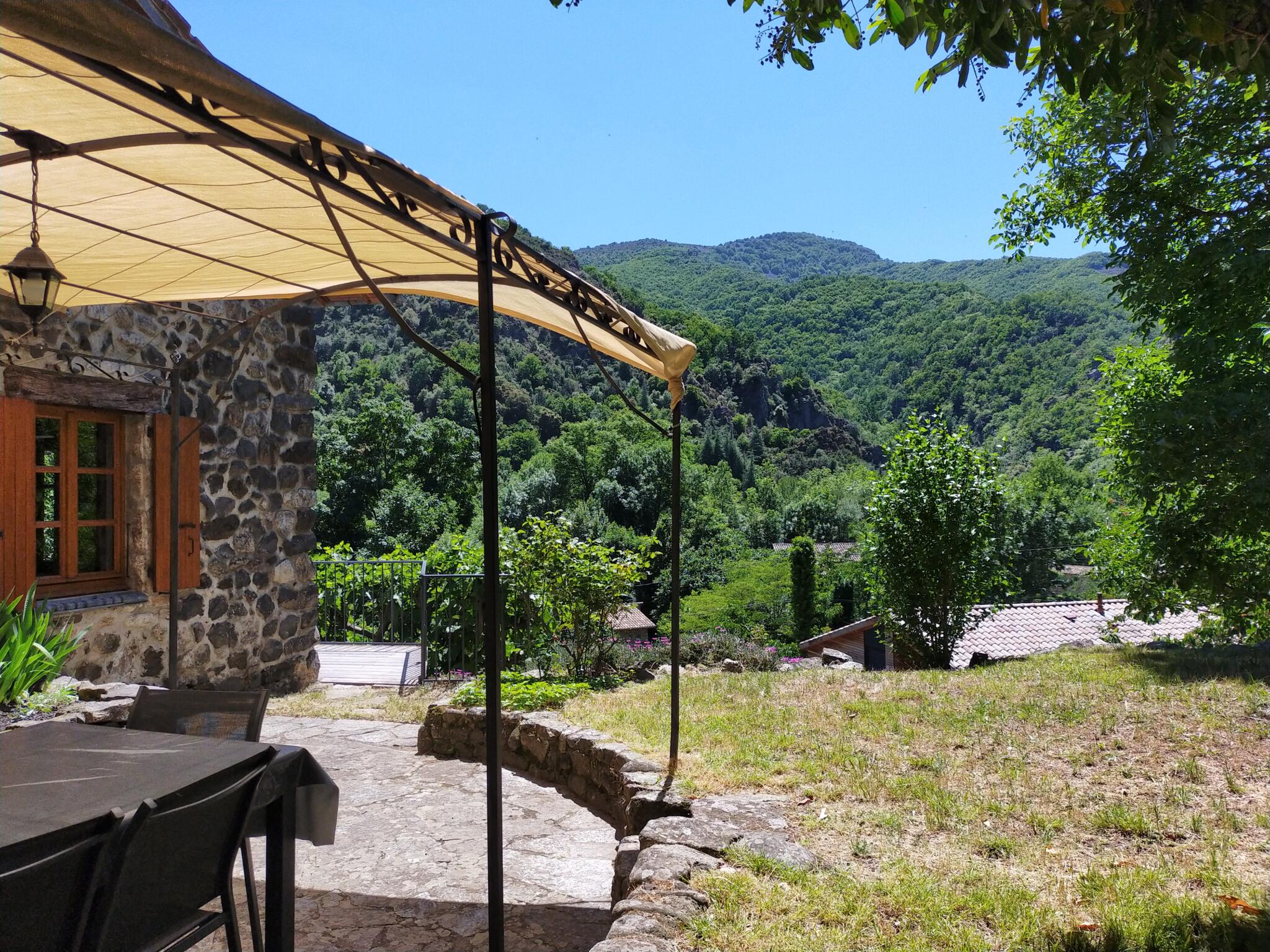 Dans un cadre de verdure, à 150 m de la plage du Pont du Diable, maison de pays pour 6 personnes avec terrasse et jardin. Vue panoramique sur la montagne. Village avec tous commerces à 10 mn à pied par un chemin de randonnée. Thermes de Neyrac à 4 km.