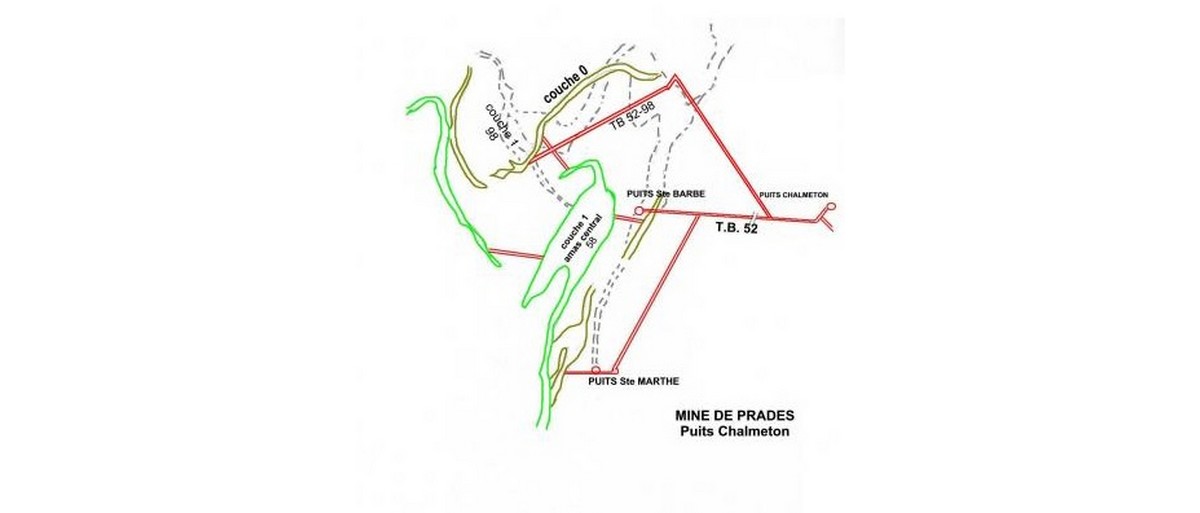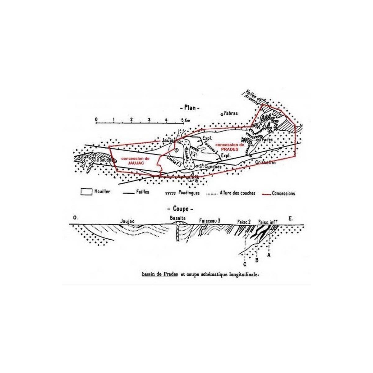 Das Kohlenfeld von Prades und seine Minen bilden eine Art Parallelogramm mit einer Breite von zwei Kilometern, das etwa zehn Kilometer von Nordosten nach Südwesten um die Gemeinden Lalevade d'Ardèche und Prades herum verläuft.
