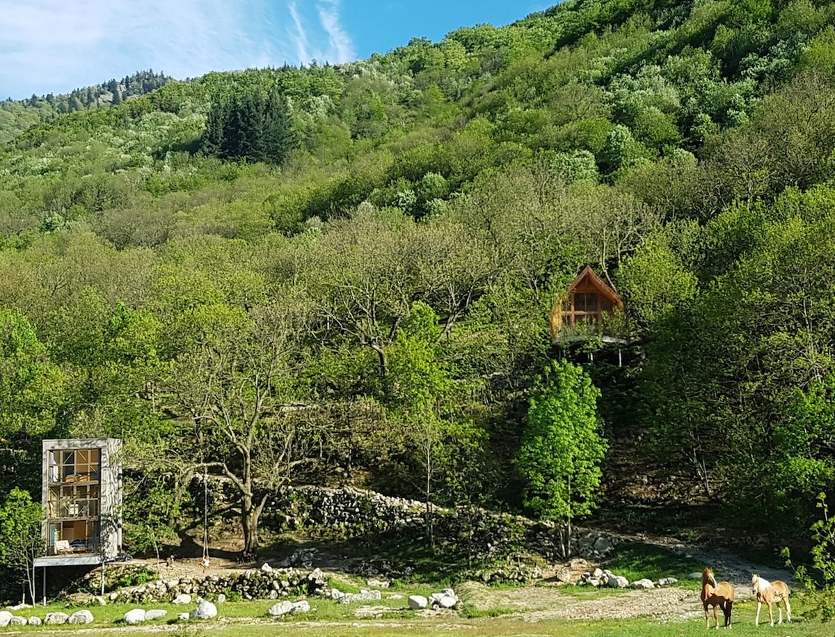 Jede Hütte hat ihren eigenen Charakter und ihre eigene Atmosphäre. Eine ragt wie ein Turm empor, die anderen verschmelzen mit den Kastanienbäumen, aber alle haben denselben Geist: Authentizität, Komfort und völliges Eintauchen in die Natur.