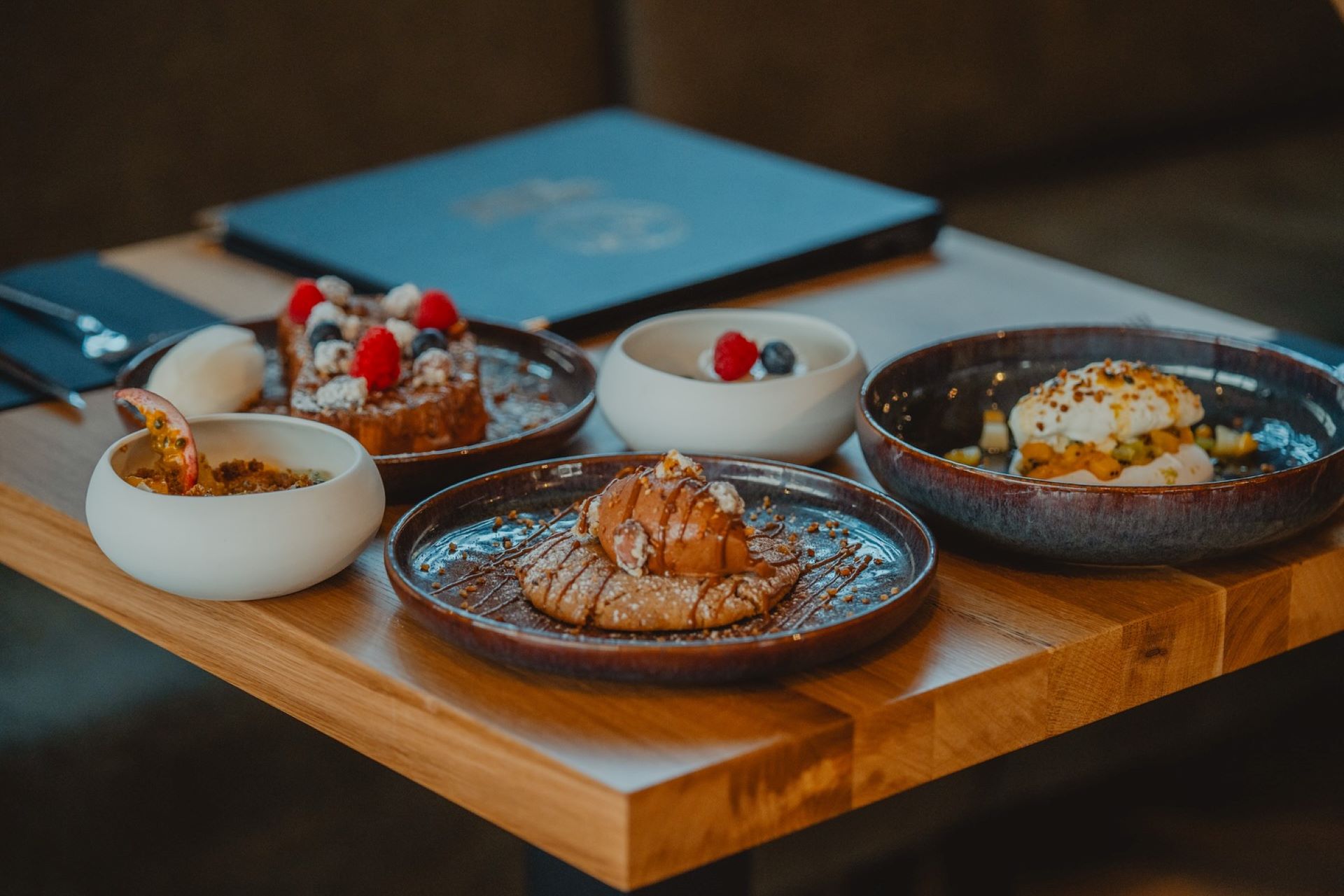 Abends à la carte: eine Auswahl an Vorspeisen zum Teilen, Platten zum Teilen, Hauptgerichten, Beilagen und Desserts.