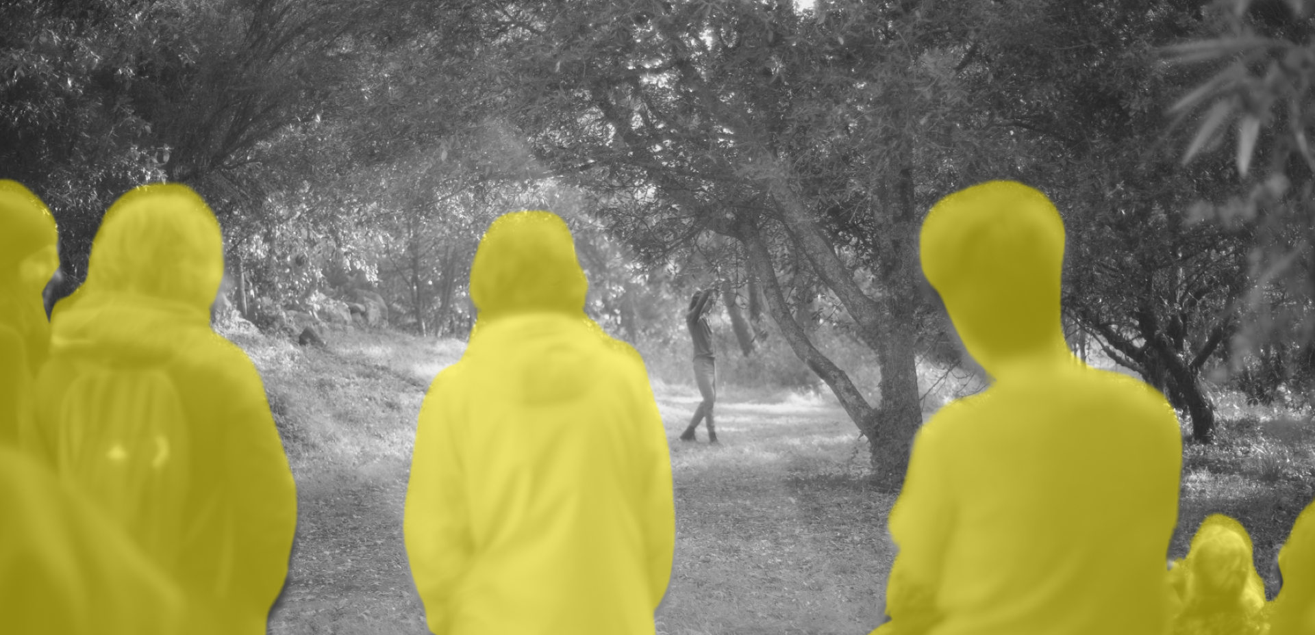 Ausgehend vom Gehen, vom Erkunden und vom sinnlichen Erfassen der äußeren Umgebung schreibt und interpretiert die Gruppe eine choreografische Partitur. Diese Arbeit stützt sich auf einen Korpus von Partituren, die speziell für den Tanz im Freien geschrieben wurden, sowie auf die Vorgehensweisen von Elena Biserna (die mehrere Anthologien über das Gehen und Zuhören verfasst hat), Pauline Oliveros (deren Chorpartituren vom Circle Song inspiriert sind), Hanna Halprin und anderen bildenden Künstler*innen.
