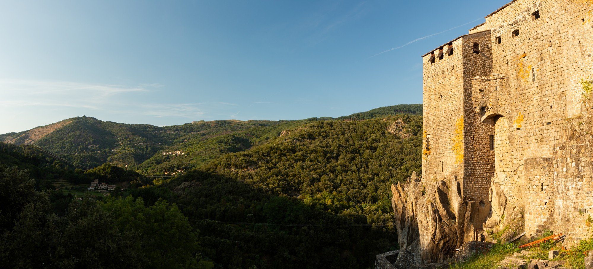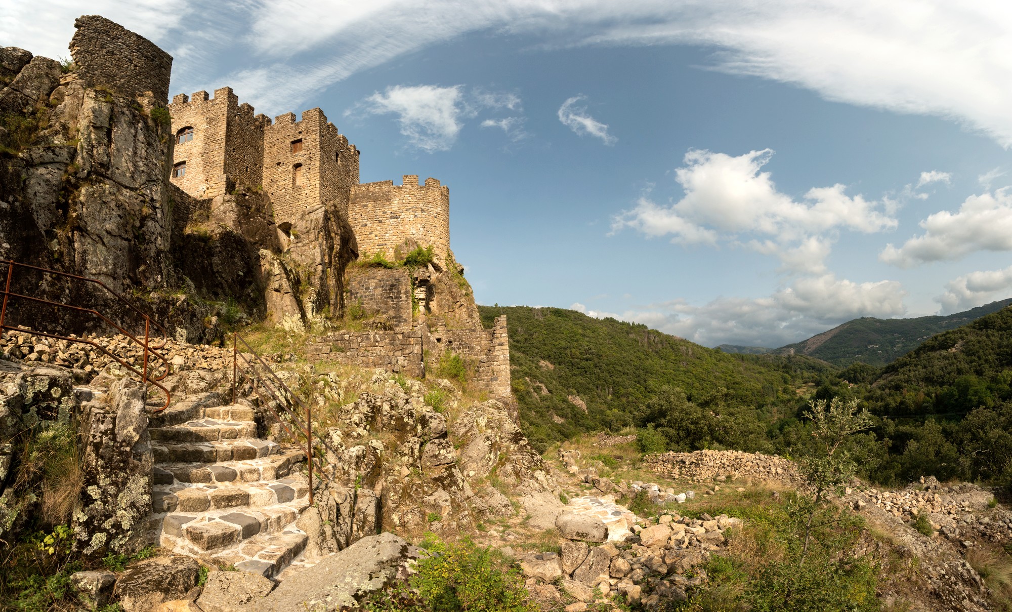 Die Burg von Ventadour steht auf dem Rocher Rolandy, einem 70 m hohen Sporn über dem Zusammenfluss der Ardèche und der Fontaulière in der Gemeinde Meyras.