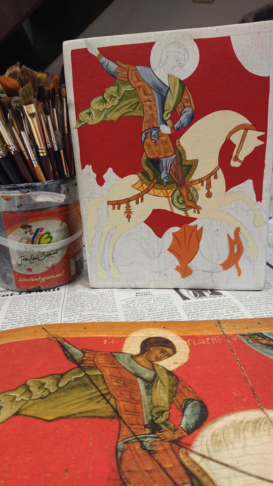Ich würde meine Arbeit als figurativ und farbenfroh beschreiben. Meine Lieblingsthemen und Inspirationsquellen sind die Natur, Buddhas, Engel, das Mittelalter ... Was die Form angeht, so ist der Hintergrund meine spirituelle Suche, meine Suche nach dem Göttlichen.