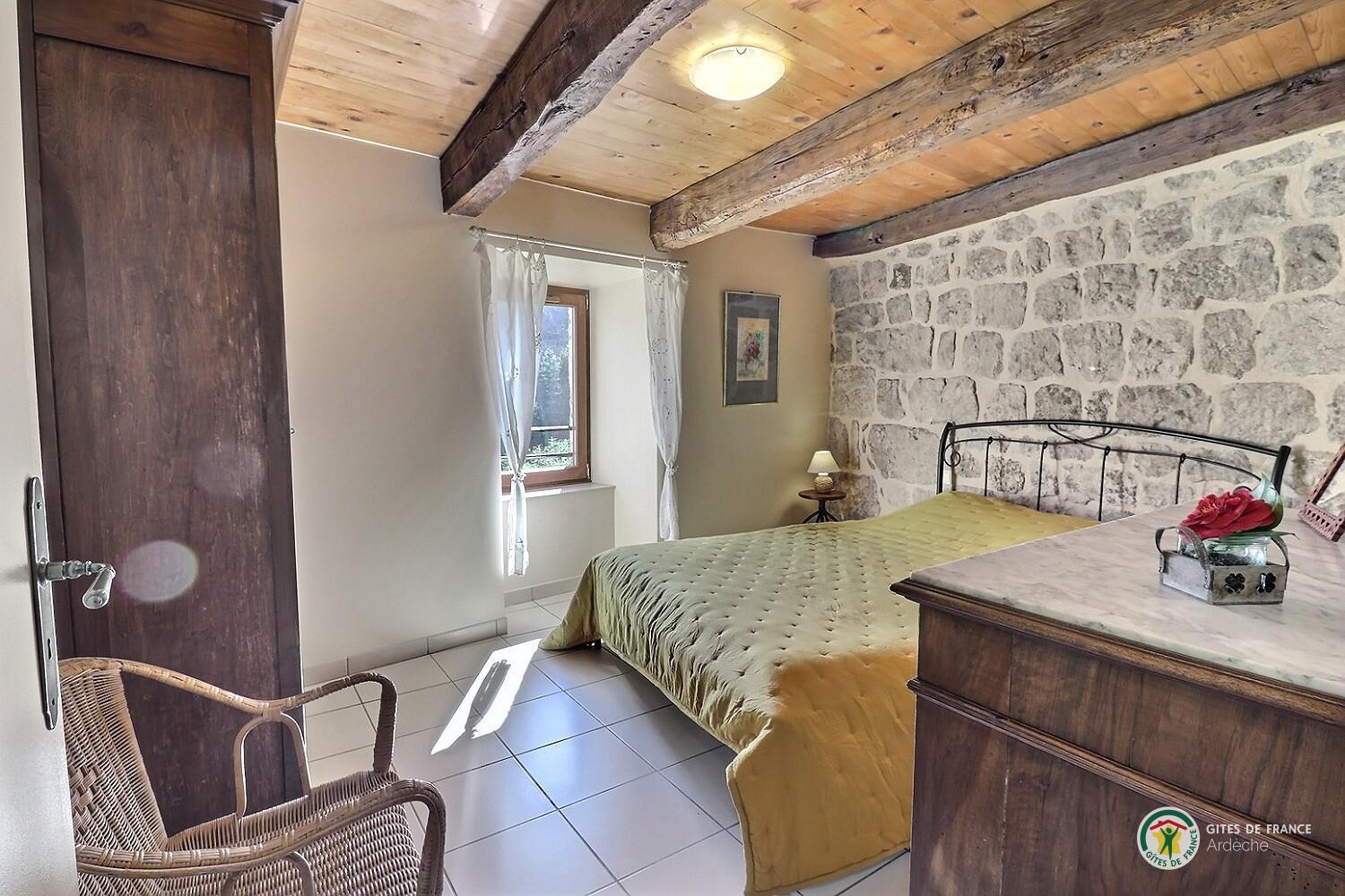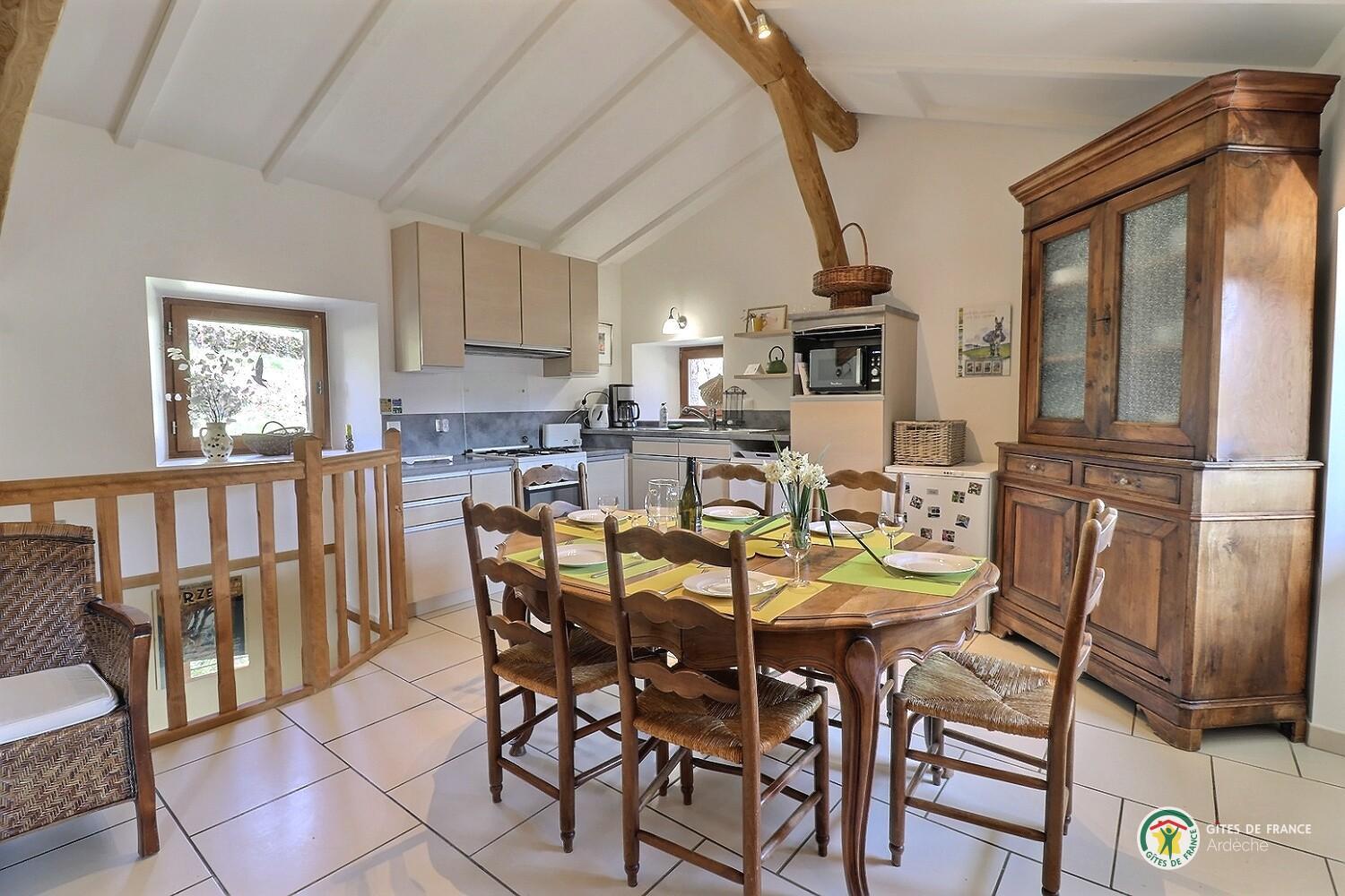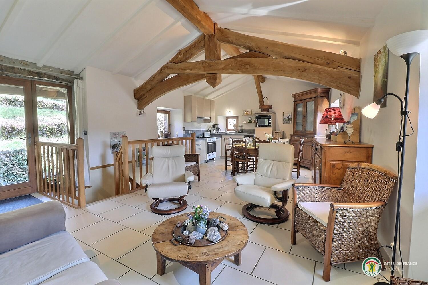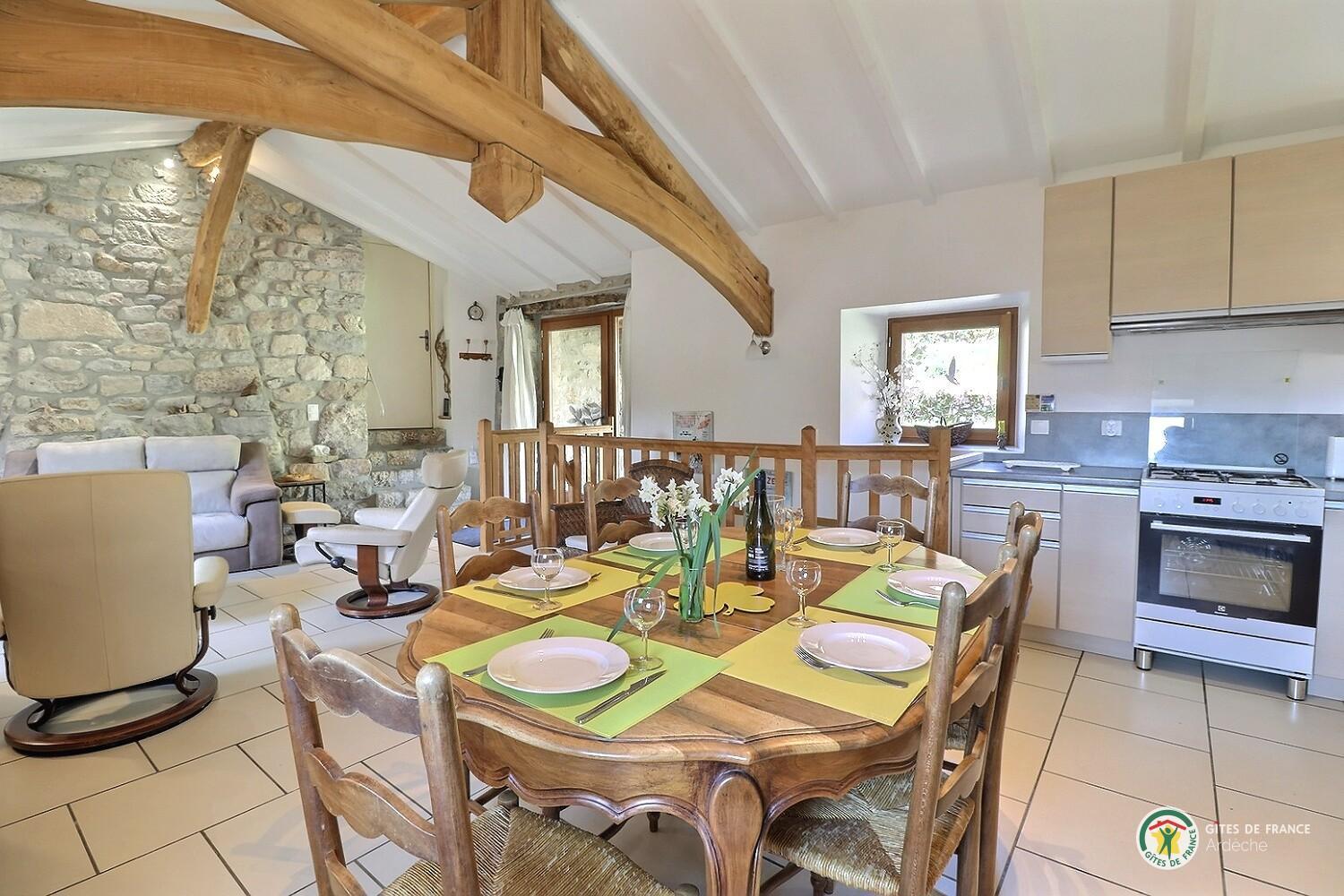 Welcome to Le Martinel, a gîte overlooking the lovely village of Burzet. Relax in the peaceful grounds (5 hectares) on banks of river Ribeyre. The ideal spot for exploring and enjoying the Monts d'Ardèche Regional Nature park. Very comfortable gîte for 6 to 8 people. Lots of period charm (old Ardèche farmhouse, stone walls, exposed chestnut roof timbers) combined with eco-friendly materials. Open-plan living room with fitted kitchen and lounge areas, bedroom (double bed, en-suite shower room), WC, shower room, WC, 2 bedrooms (double bed) (2 sets of single bunks). Non-adjoining garden 8m away.
