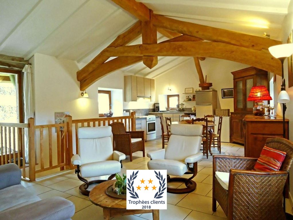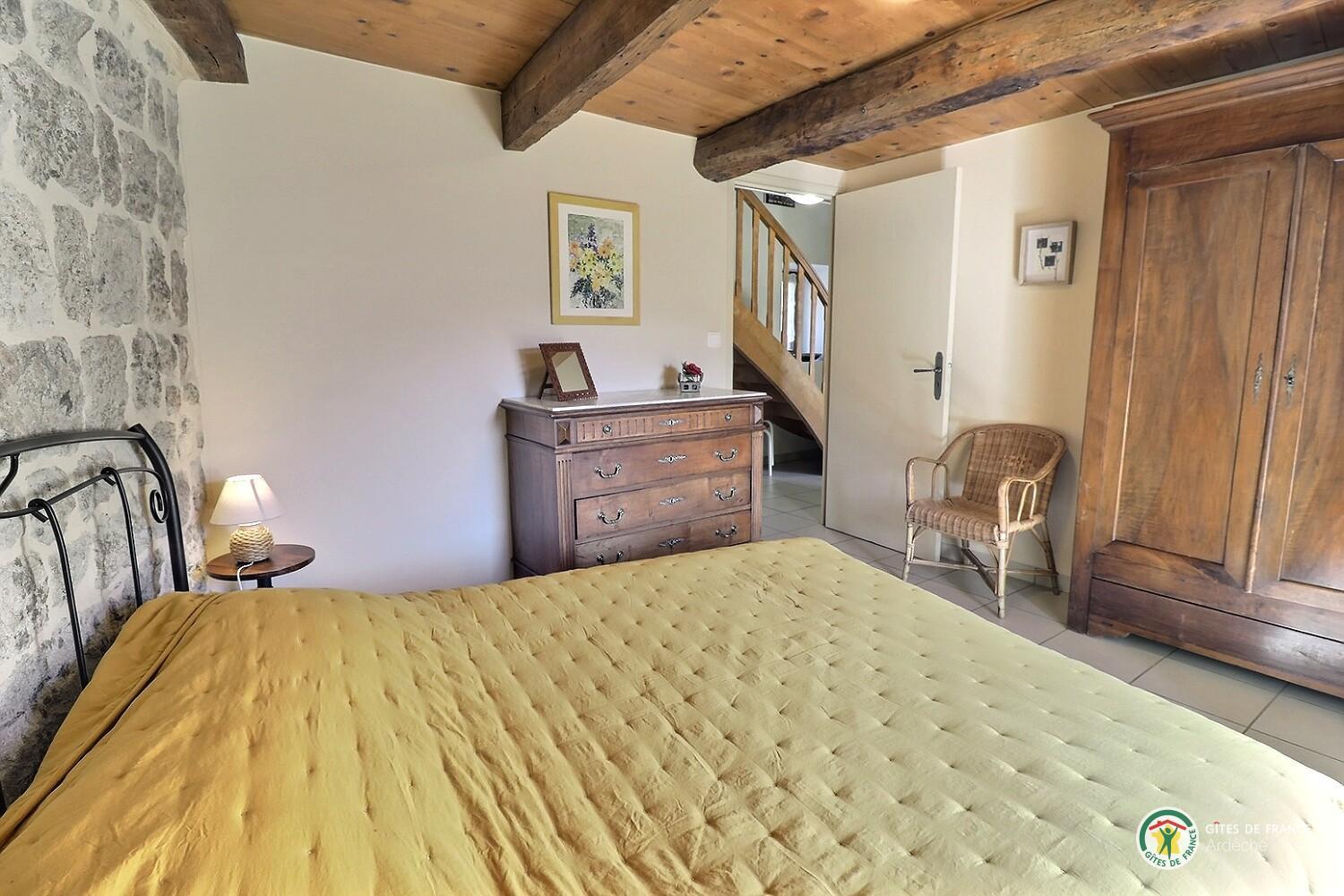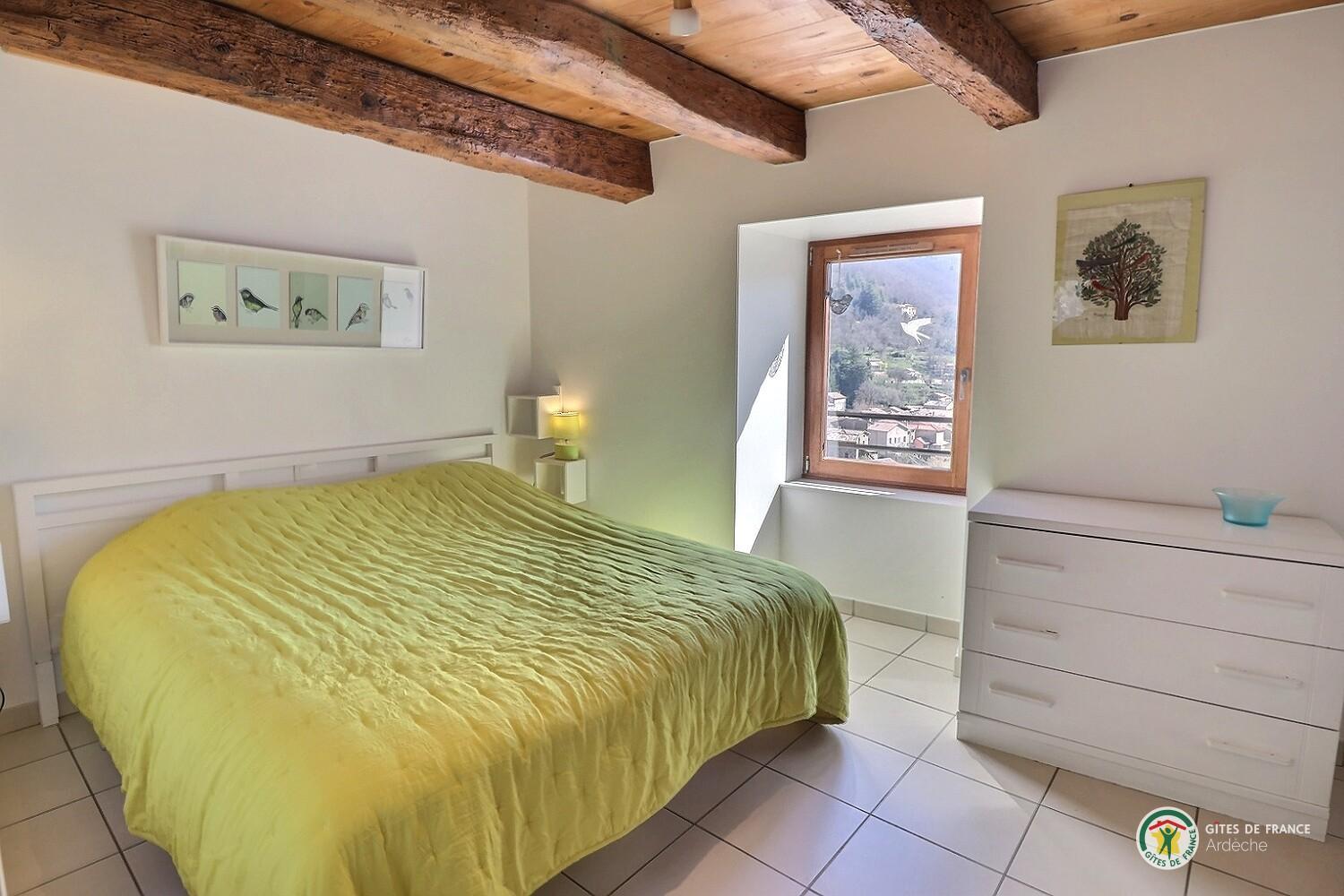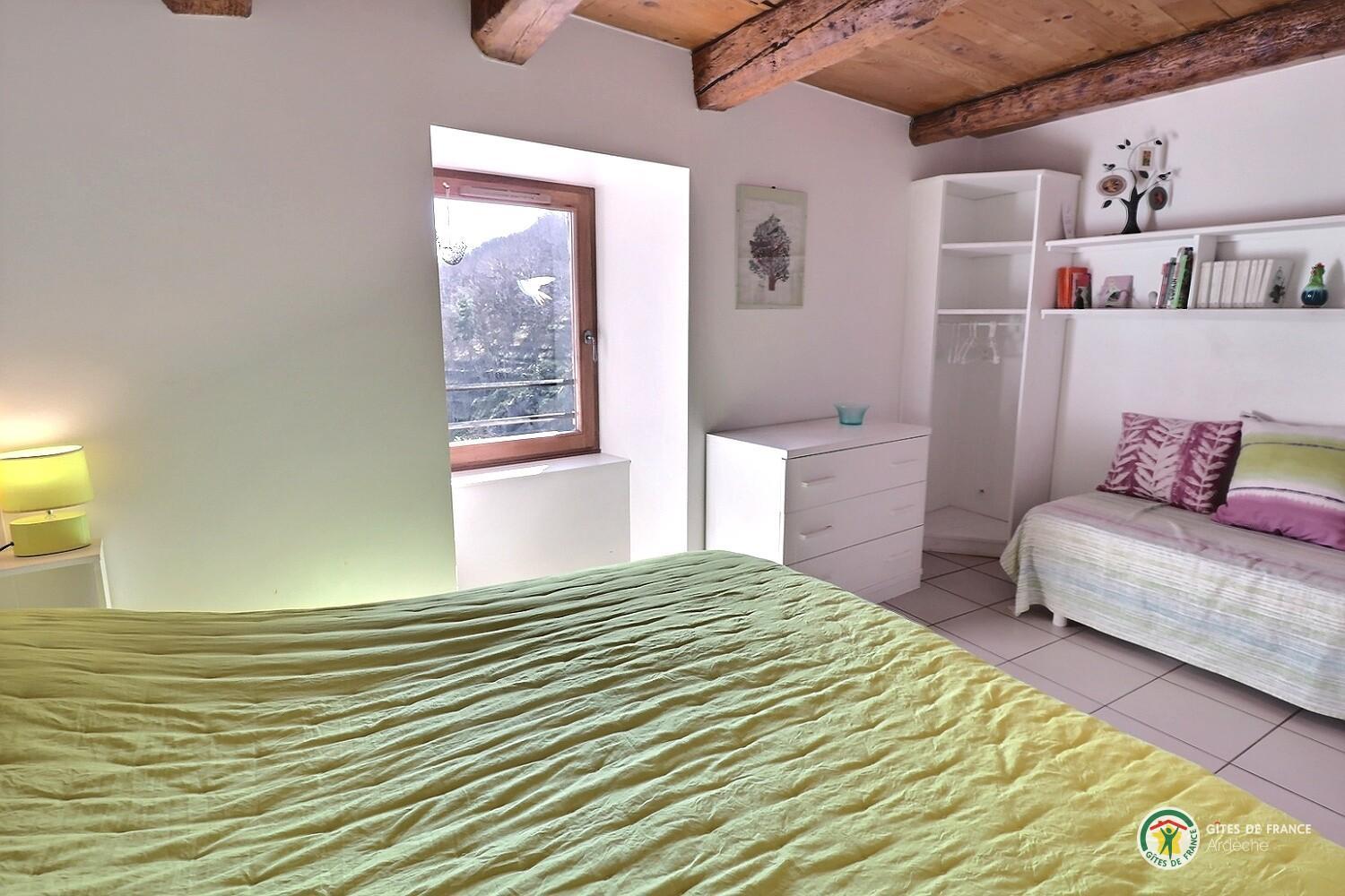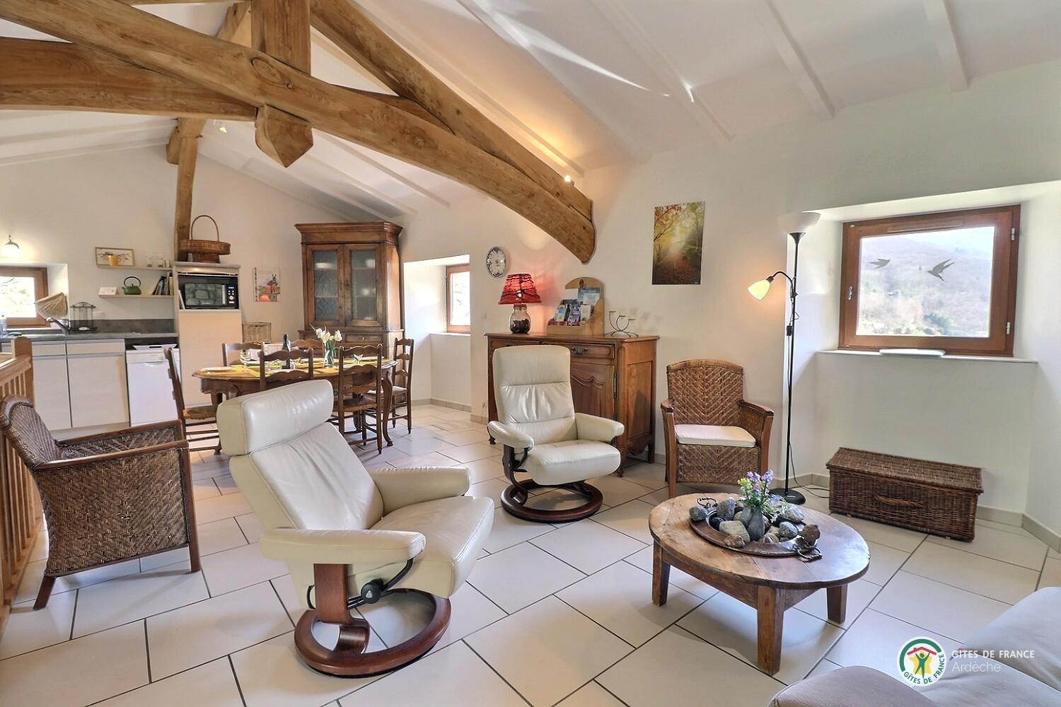 Welcome to Le Martinel, a gîte overlooking the lovely village of Burzet. Relax in the peaceful grounds (5 hectares) on banks of river Ribeyre. The ideal spot for exploring and enjoying the Monts d'Ardèche Regional Nature park. Very comfortable gîte for 6 to 8 people. Lots of period charm (old Ardèche farmhouse, stone walls, exposed chestnut roof timbers) combined with eco-friendly materials. Open-plan living room with fitted kitchen and lounge areas, bedroom (double bed, en-suite shower room), WC, shower room, WC, 2 bedrooms (double bed) (2 sets of single bunks). Non-adjoining garden 8m away.