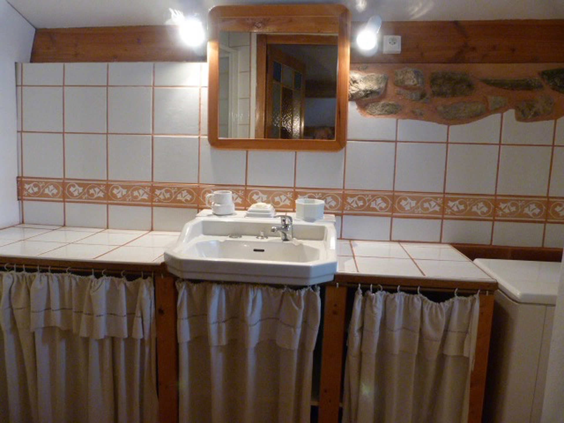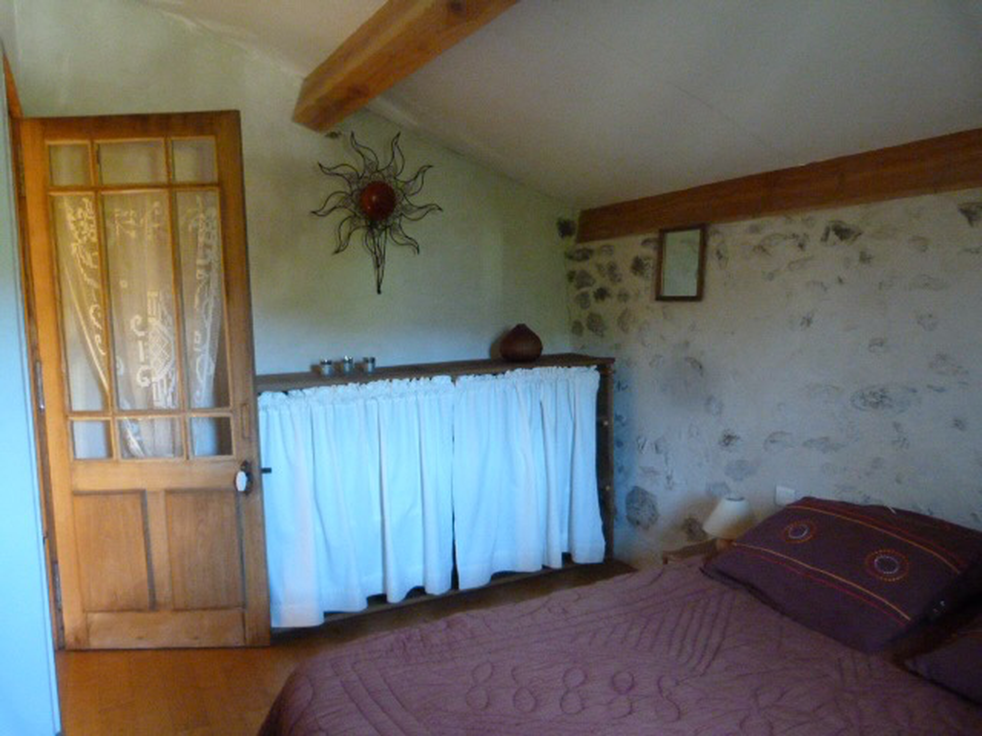 A fully restored former chestnut dryer, this 40 m² gîte, decorated with warm wood and old stone, comprises a living room with kitchen area and a WC on the ground floor. Upstairs, there is a spacious bedroom with a desk area and a bathroom with washbasin, shower and washing machine.