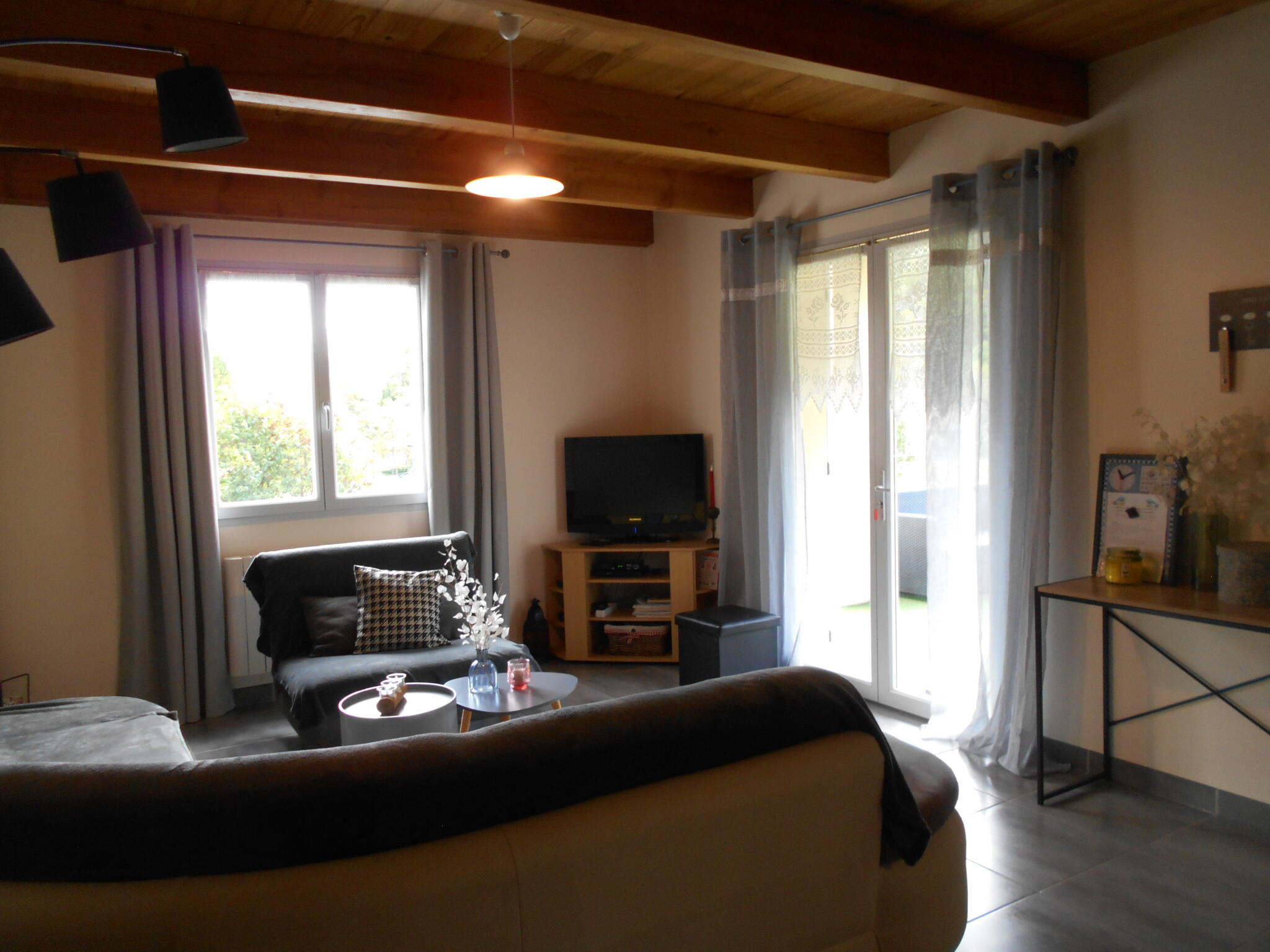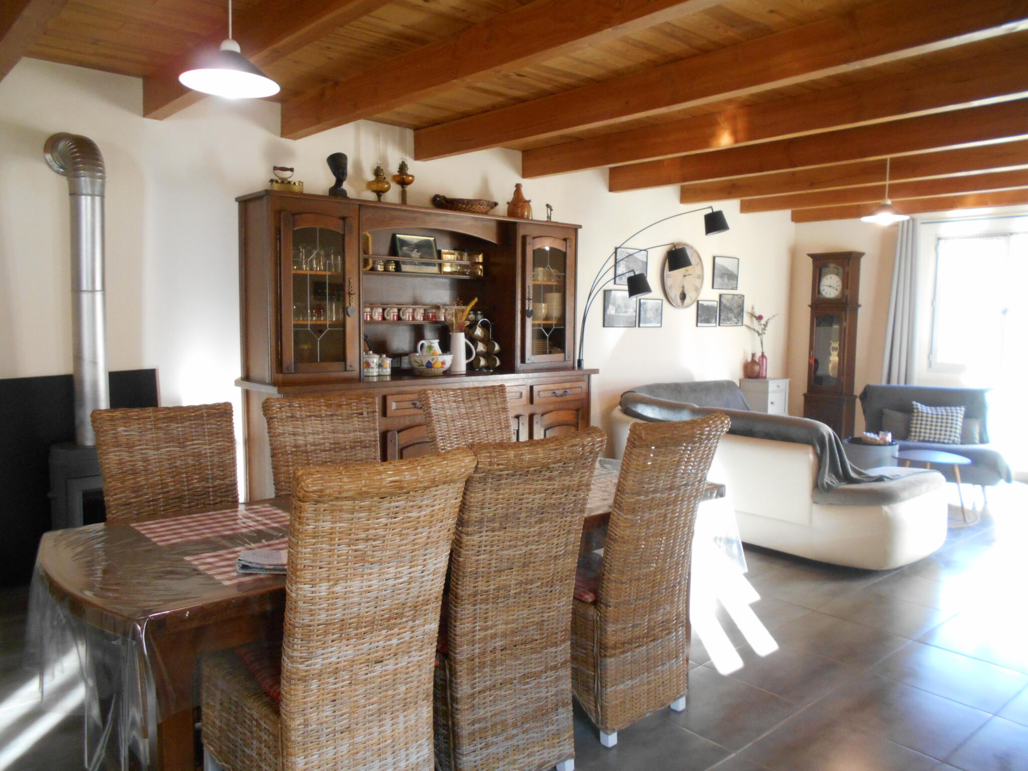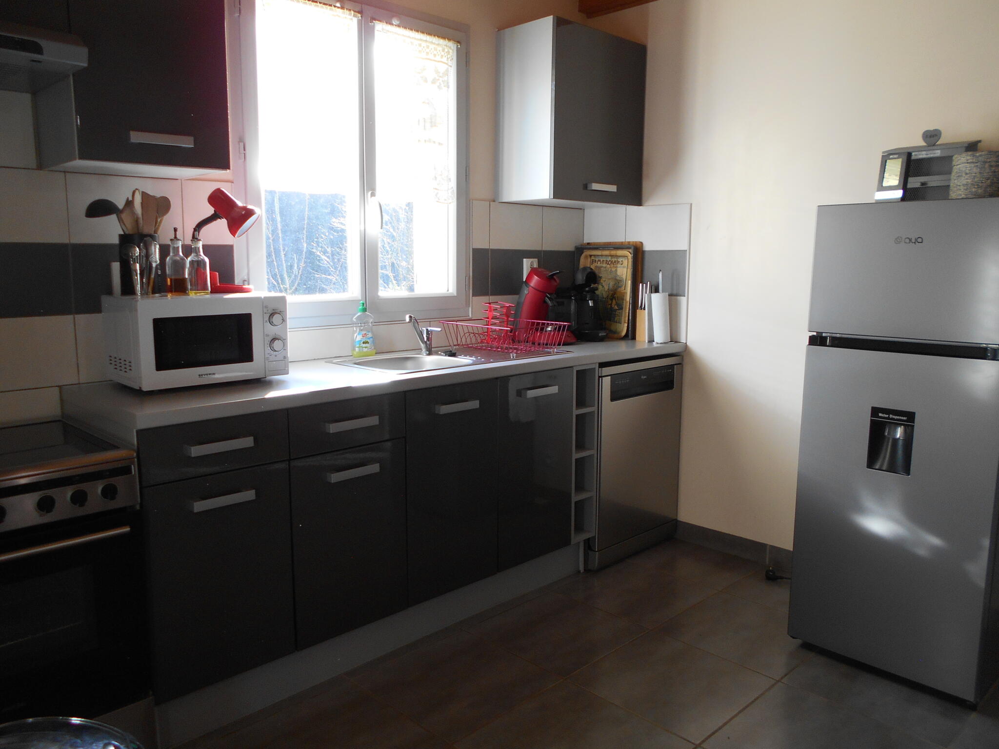 - a living room with a fully equipped kitchen area (induction cooker, dishwasher, microwave, fridge-freezer, standard coffee maker, Senseo coffee maker and Tassimo coffee maker, kettle, toaster), TV, DVD player, wood-burning stove (wood provided)