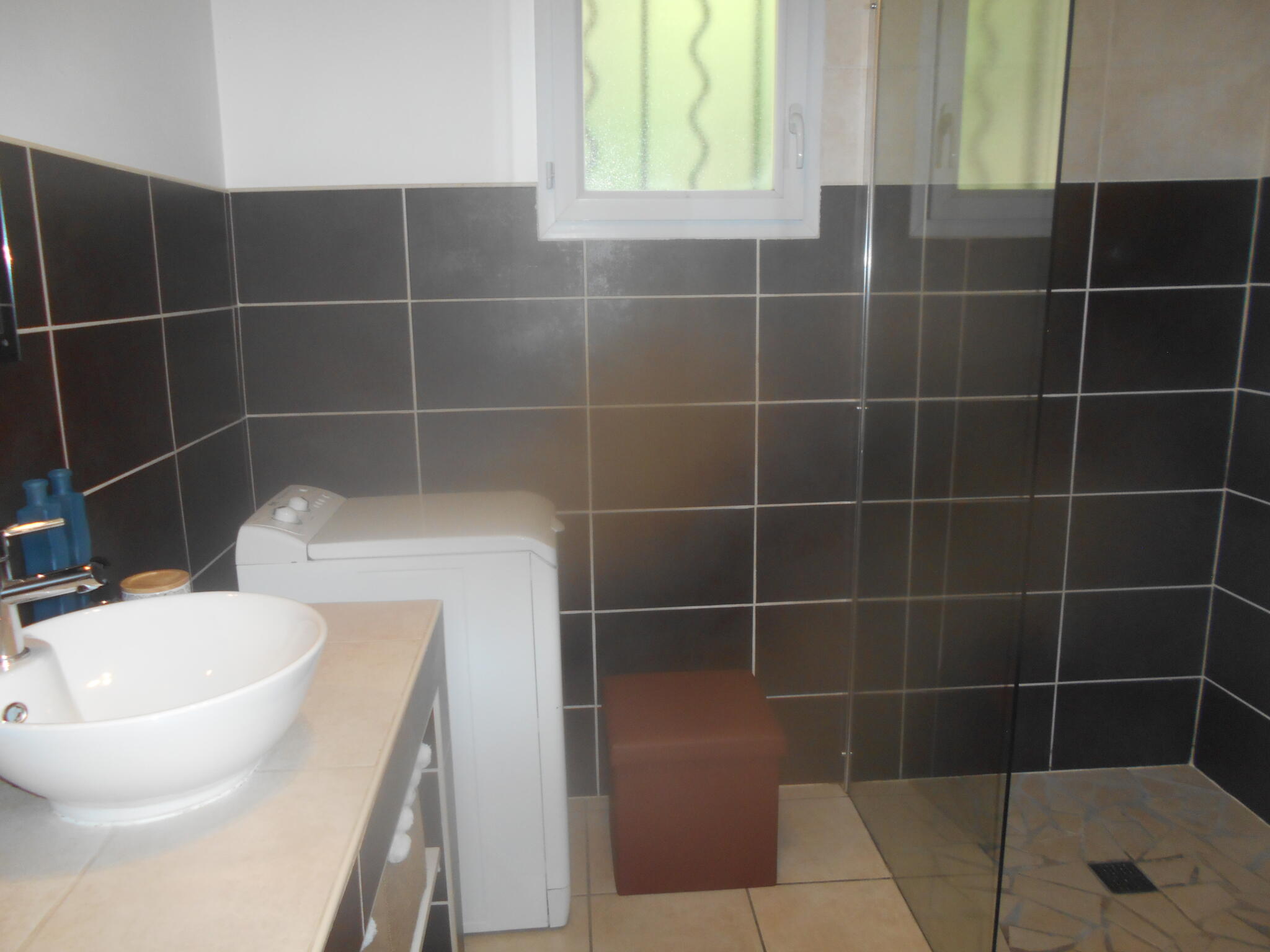 - a bathroom with walk-in shower, washing machine, iron and ironing board, hairdryer