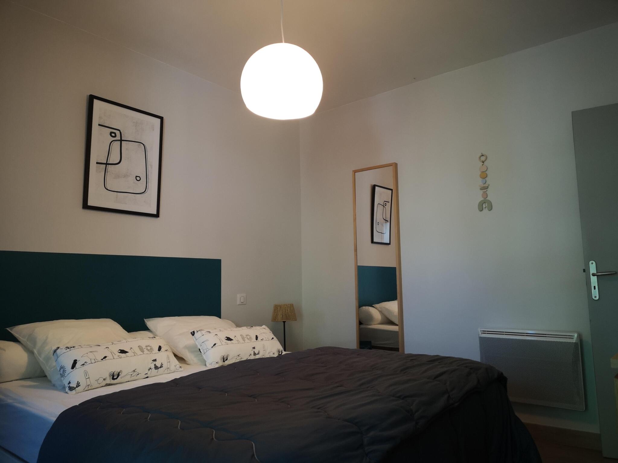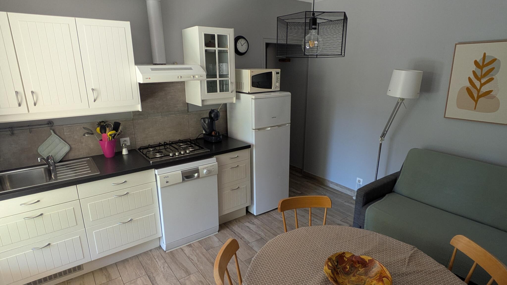 1 bedroom (1 double bed), separate toilet, kitchen open to the living room (with 1 sofa bed)