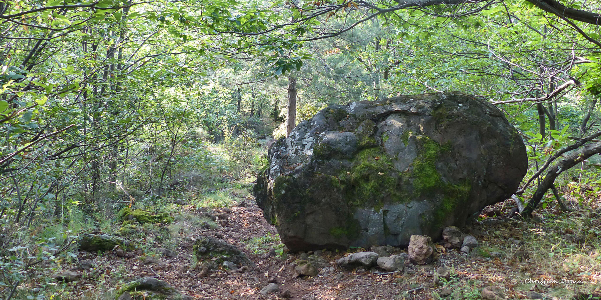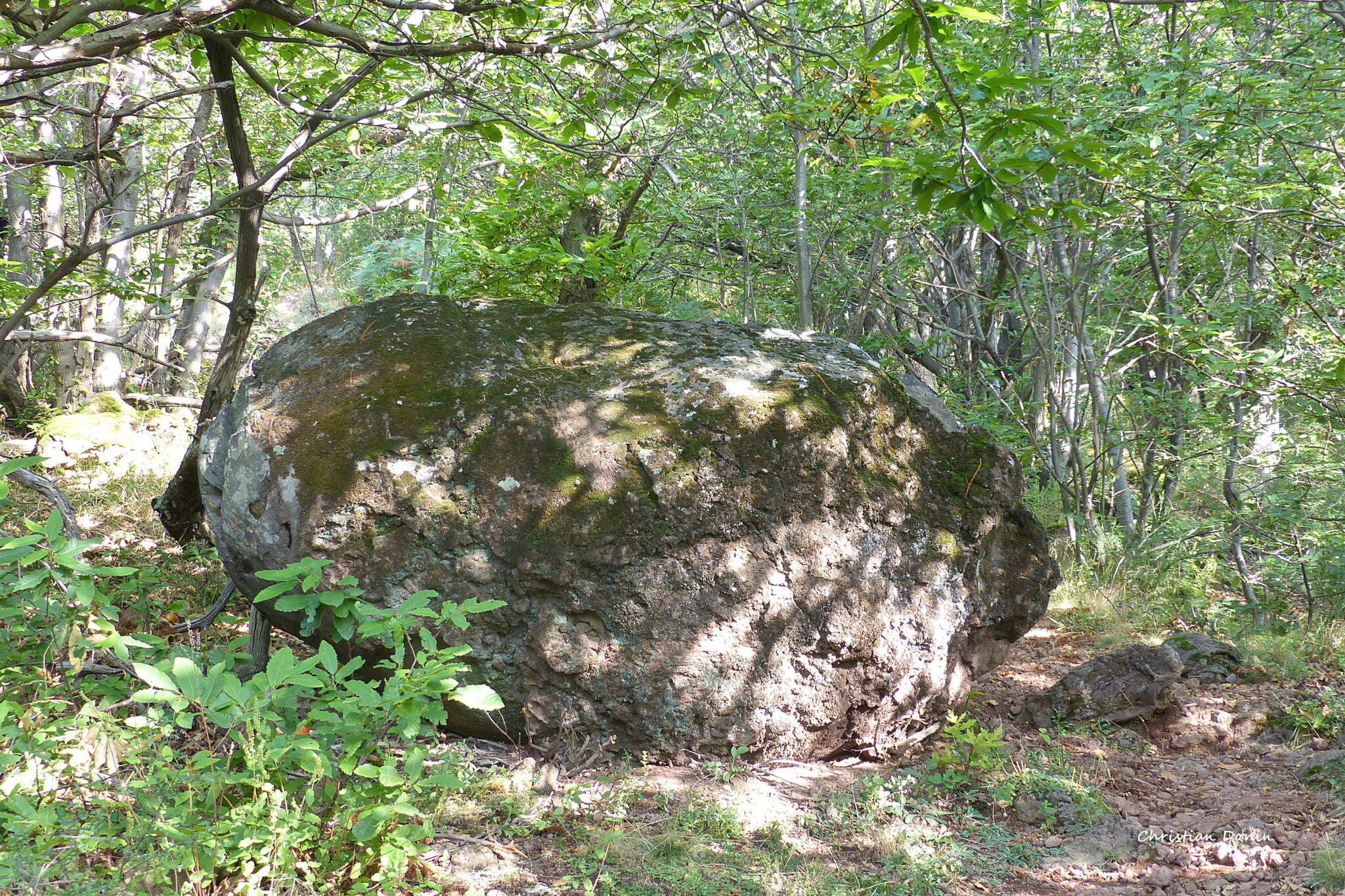 This is the largest volcanic bomb in the Ardèche's young volcanoes. This bomb (the lip of the Souilhol crater) has a vaguely tapered appearance and probably weighs between seven and ten tonnes. It can be seen on the walk to Souilhol.