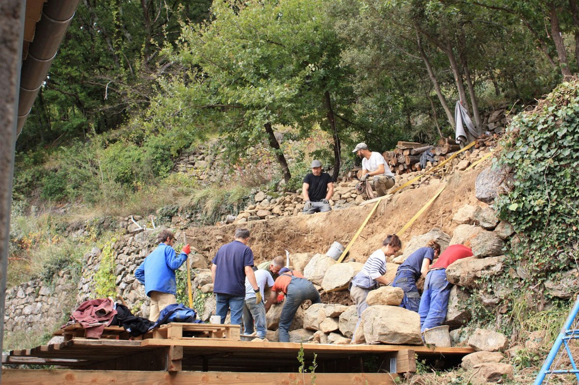 - À Chirols, quelques bénévoles ont commencé à ranger les bois de coupe puis à débroussailler, d’autres apprennent à travailler la pierre sèche pour réparer les brèches que le temps, les pins et les intempéries ont provoquées.