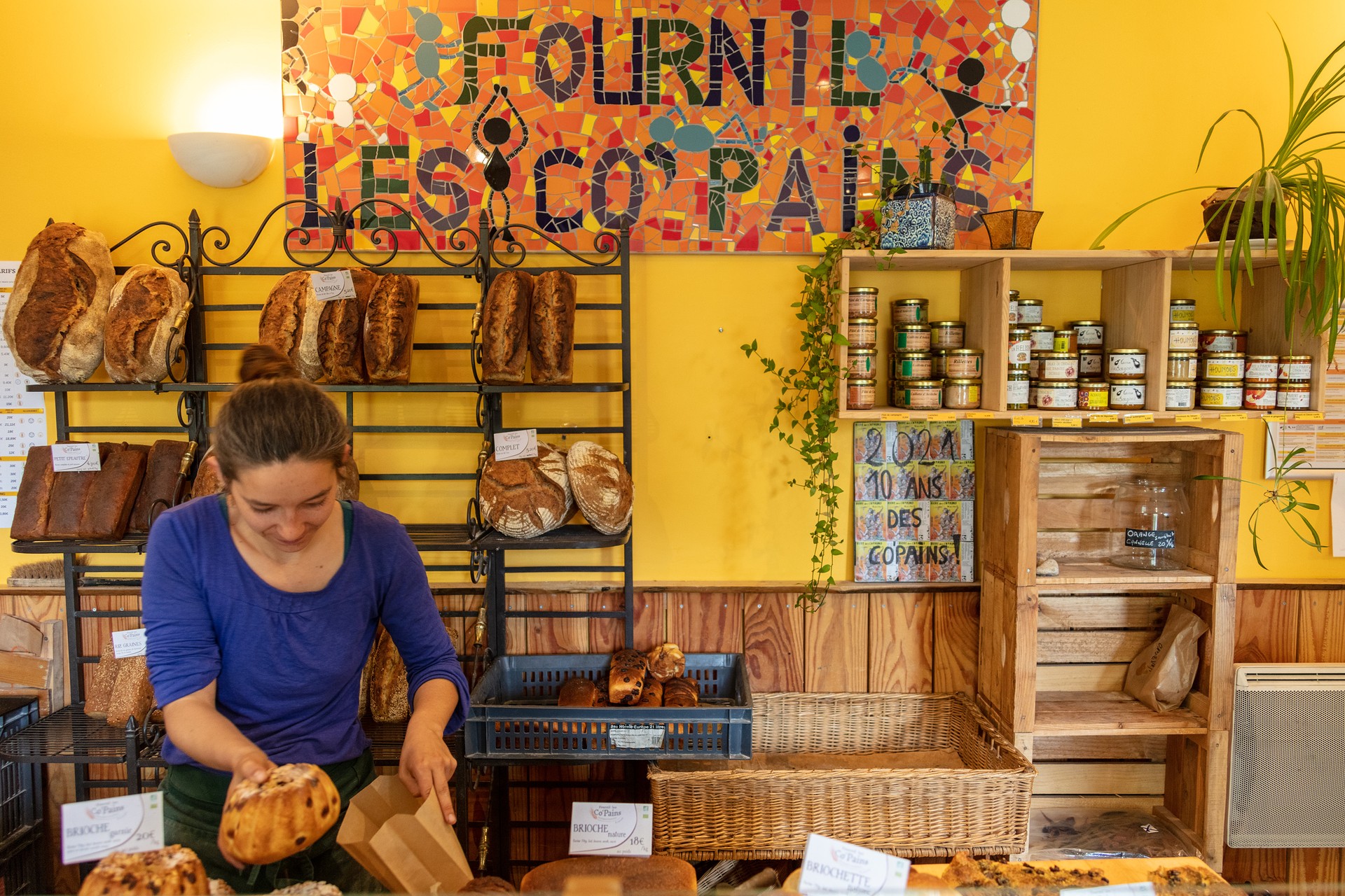 Le Fournil les Co’pains est une Scop (société coopérative de production) qui propose du pain au levain bio cuit au feu de bois, des délices boulangers sucrés et salés, ainsi qu’un bar proposant boissons et petite restauration et concerts en saison.