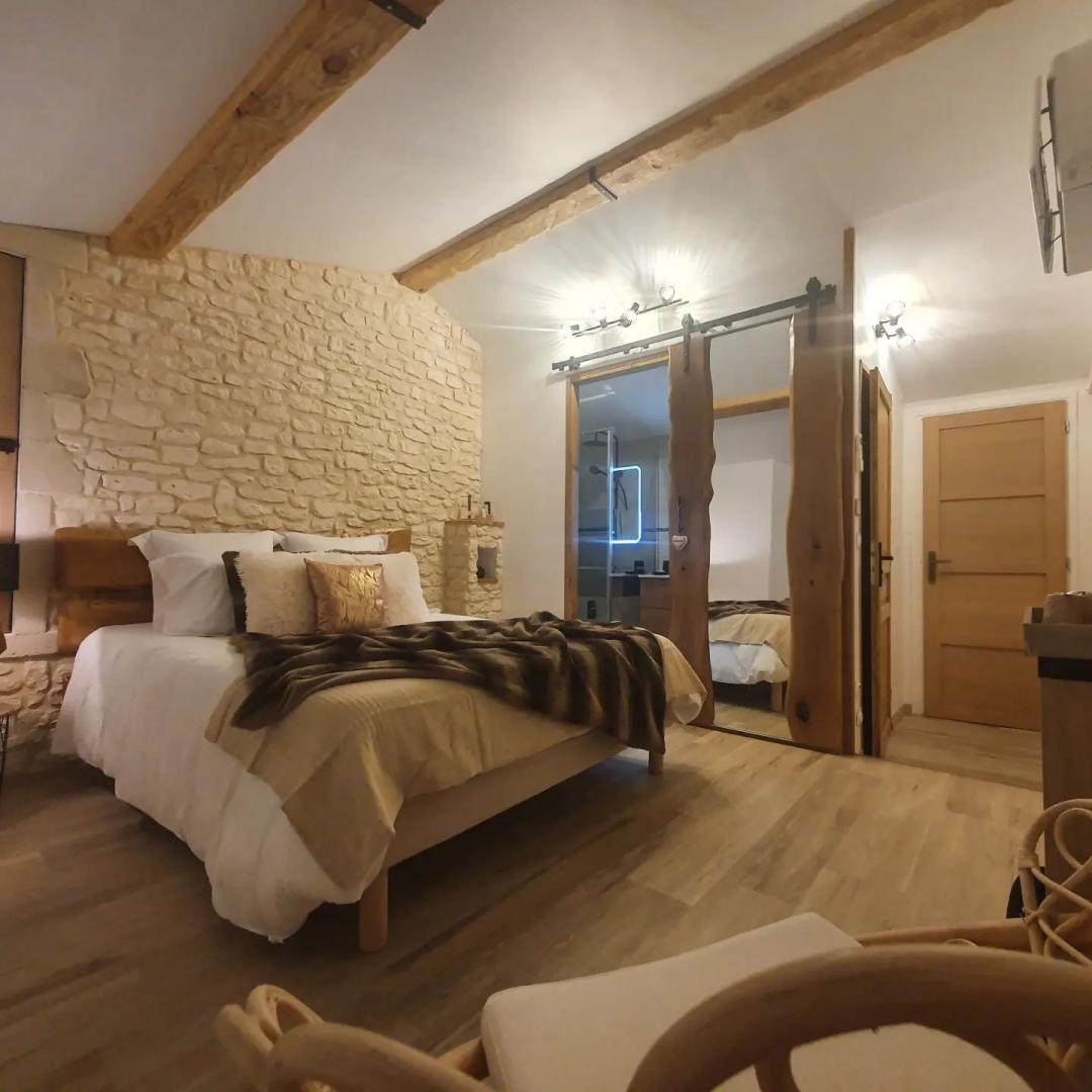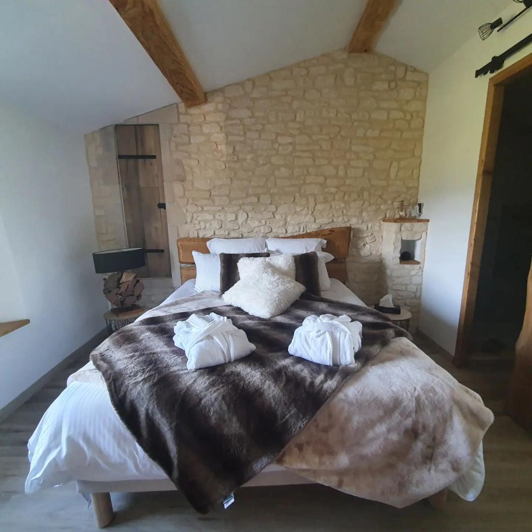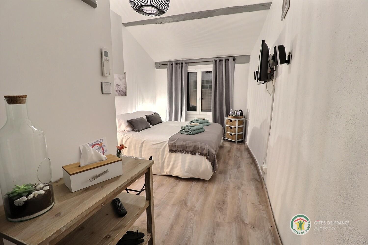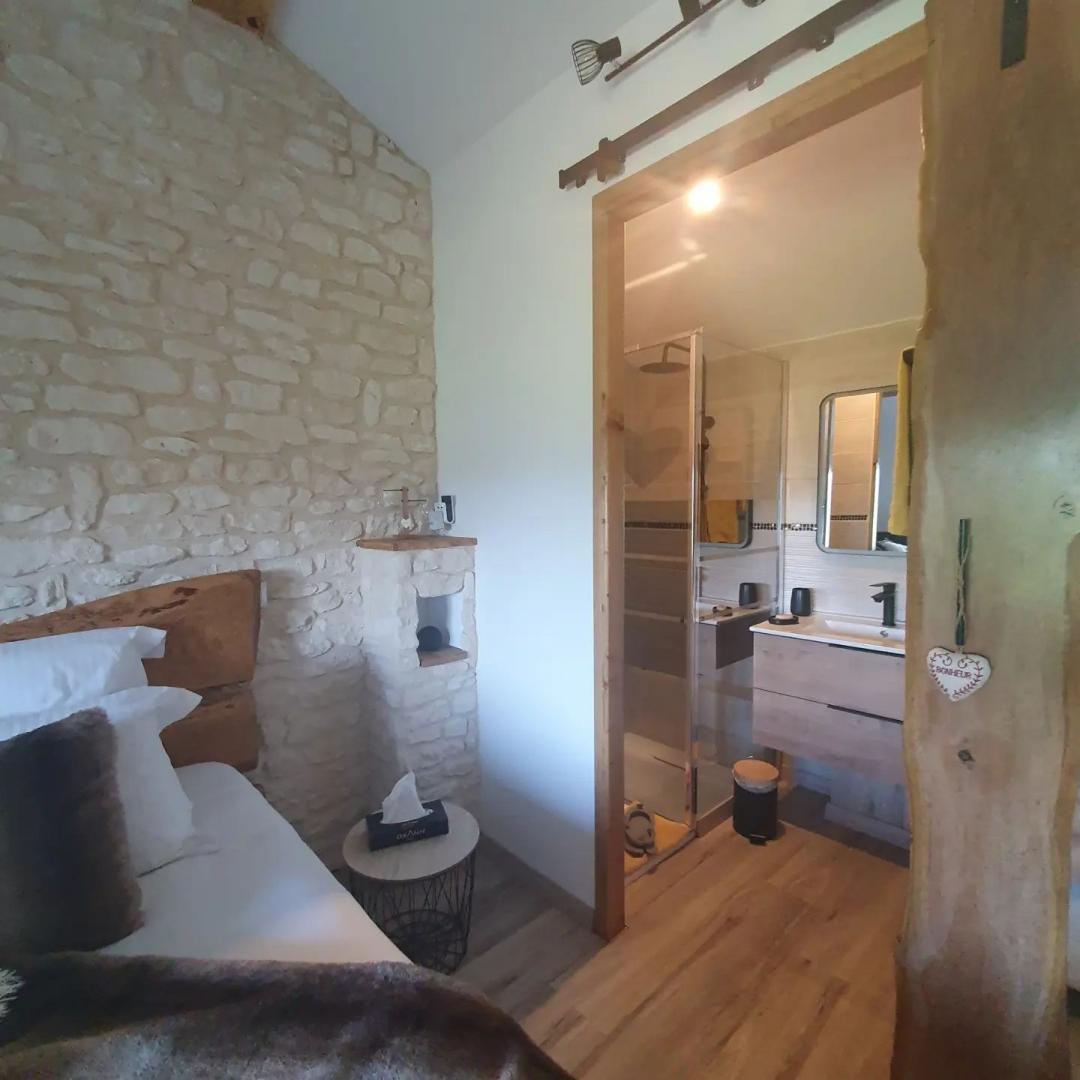 La 1ère chambre "Ladenne" est équipée d'un lit en 160 (modulable en 2 lits de 80 sur demande), d' une salle d'eau privative avec cabine de douche à jets et toilettes.