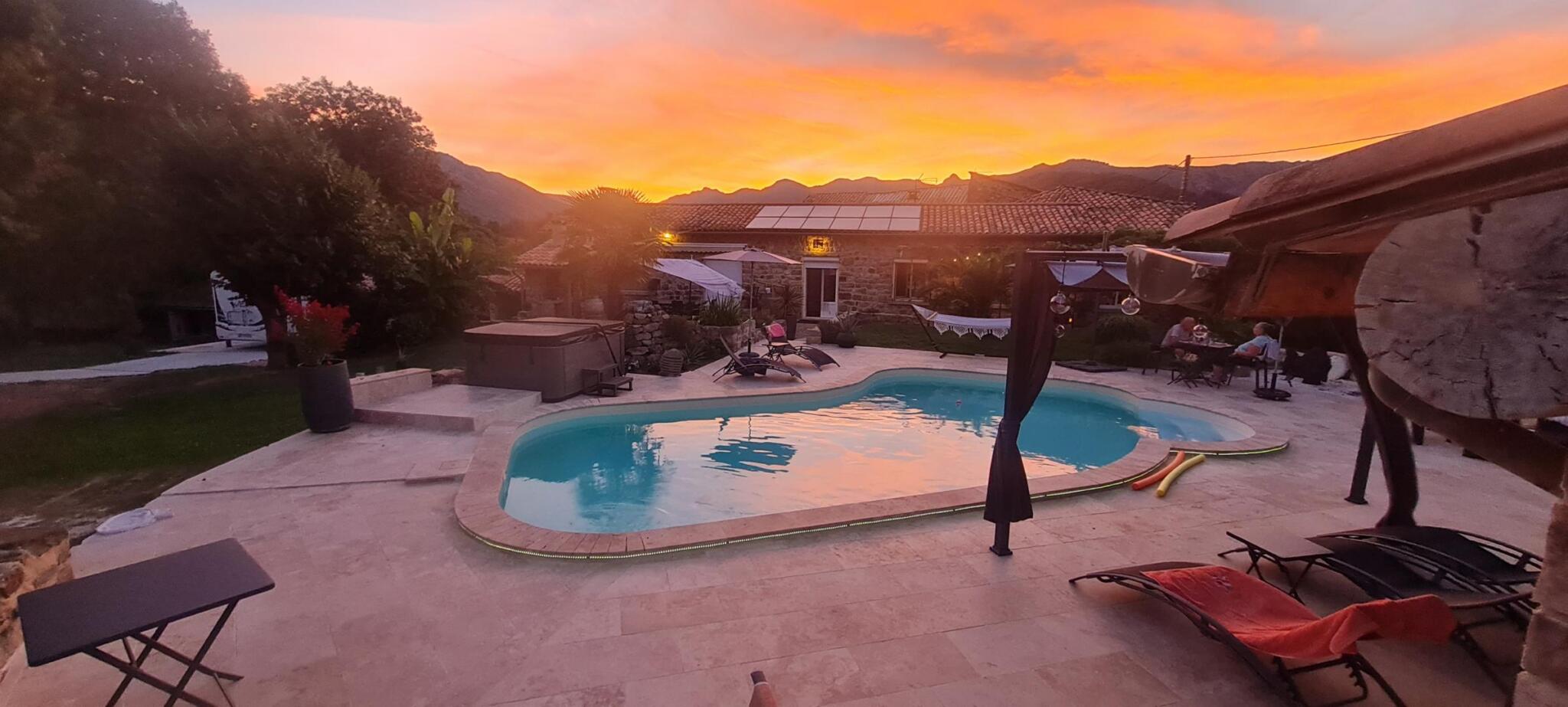 Sur place, piscine extérieure à partager (9mx5) (ouverte d'avril et octobre, chauffée) et jacuzzi. Un pool house doté d'un bel espace cuisine commune toute équipée (micro-ondes, réfrigérateur, barbecue....) vous est réservé pour vos repas, apéros... Les petits déjeuners sont servis sur l'une des différentes terrasses. Un parking privé est à disposition avec également la possibilité de garer les deux roues.
