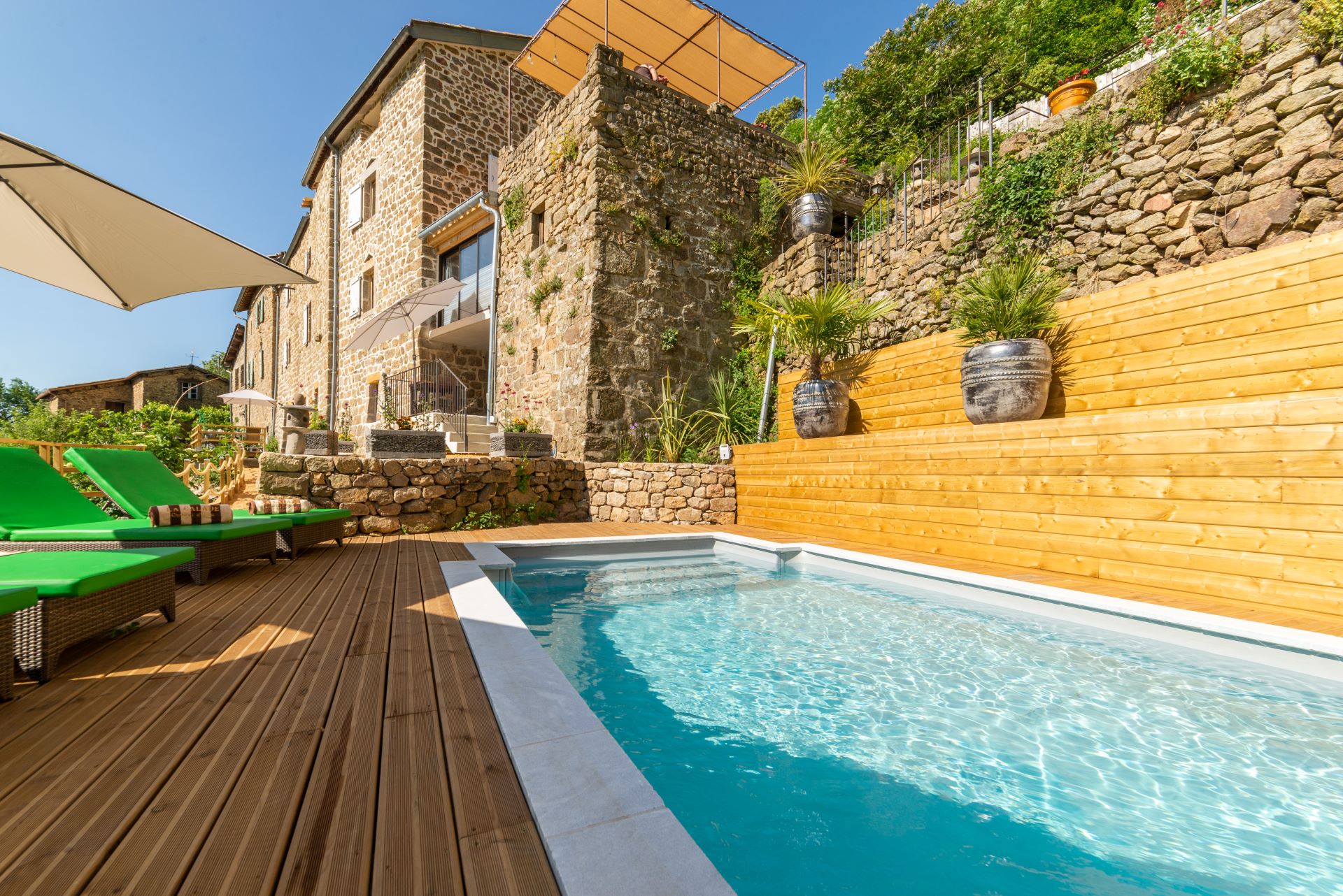 Notre ferme fortifiée, dont les 1ères pierres furent posées au XVe, se situe au cœur du PNR des Monts d’Ardèche. Nous serons heureux de vous faire partager le calme et la beauté d’une nature restée sauvage. Nouveauté : piscine , Spa et Balnéo 2 places