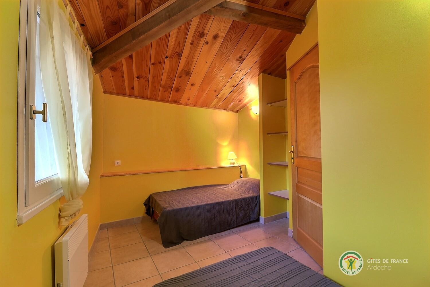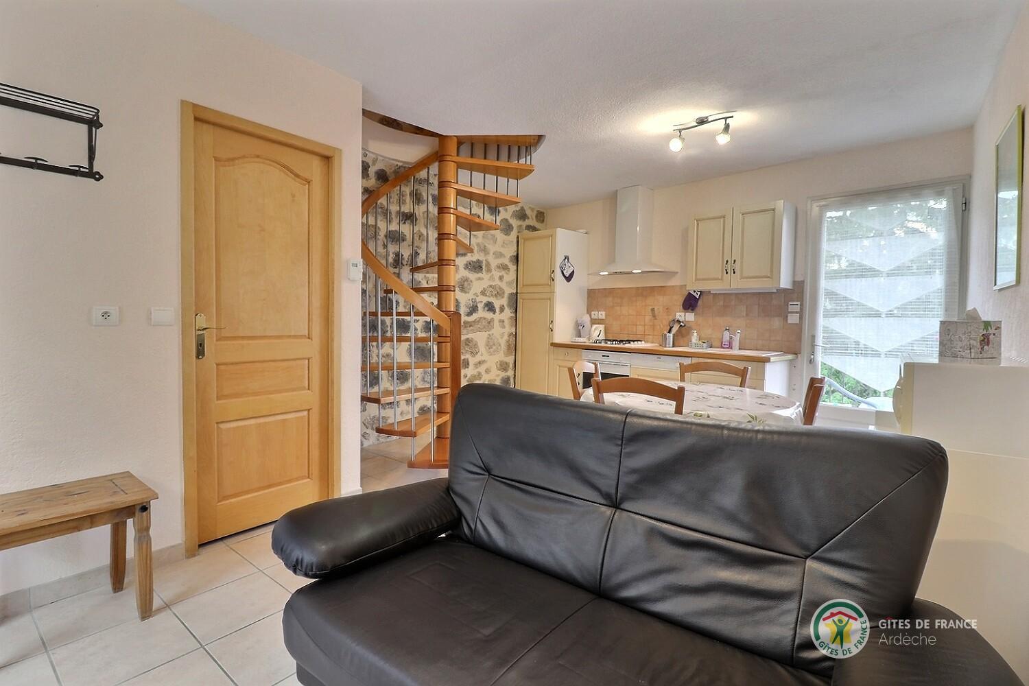 Vente de produits de la ferme sur place. Le prunier: séjour, c.salon, c.cuisine intégré, 1ch(1 lit 2 pers), 1ch(2 lits 1 pers), lecteur DVD, salle d'eau, wc, chauff électr, terrasse. Le gîte est sur 2 niveaux. Nous sommes à mi chemin de la montagne ardéchoise et de la basse Ardèche, Aubenas à 20min. Réduction de 5% à partir de la 2ème semaine de location consécutive.