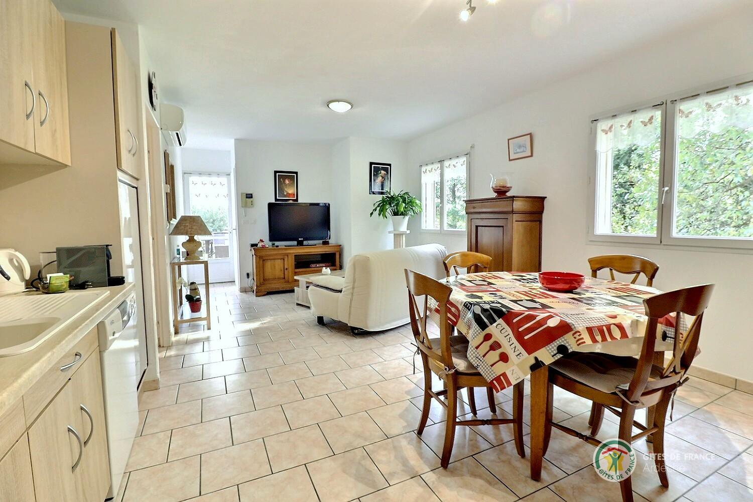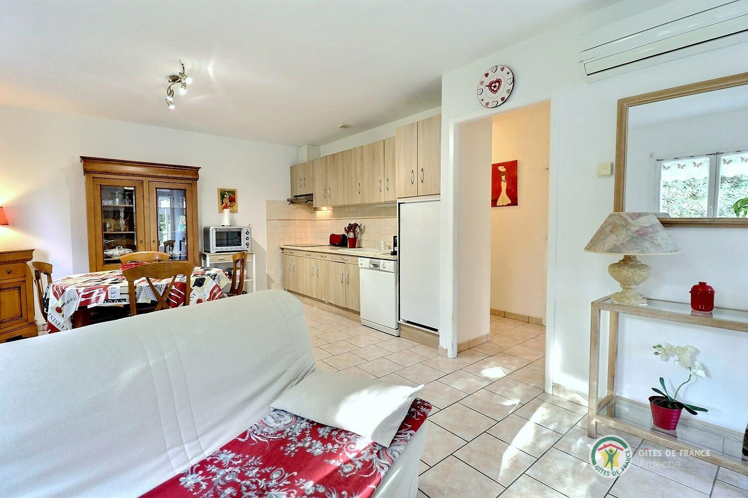 Il est composé d'une pièce de vie climatisée avec salon (canapé ,TV, wifi) coin repas, cuisine toute équipée, d'une chambre (lit en 160), d'une salle d'eau, wc indépendant, cellier.