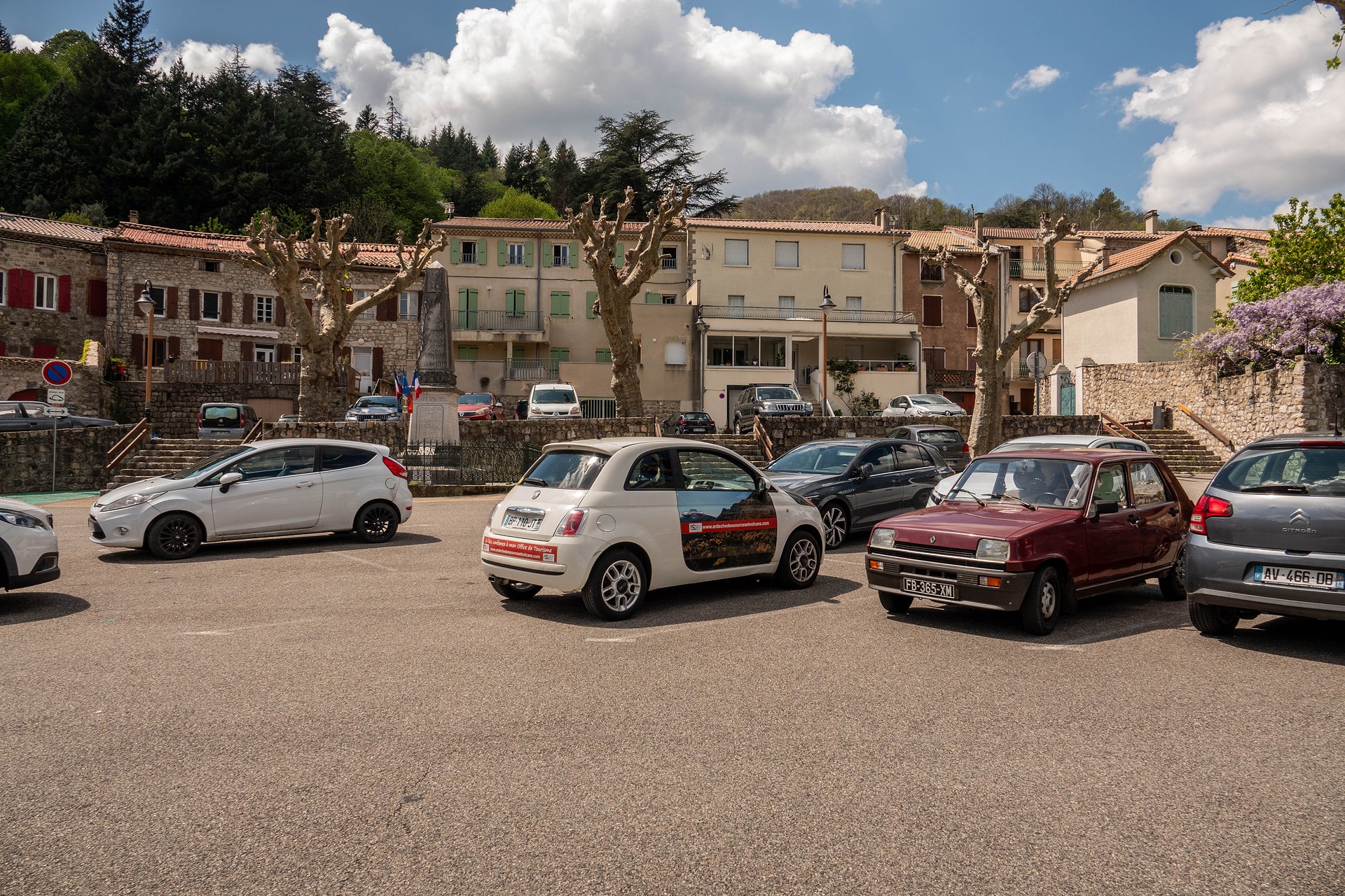 Parking et zone de stationnement Place de la Paix avec 70 places voiture et 2 places PMR à Montpezat sous Bauzon.
