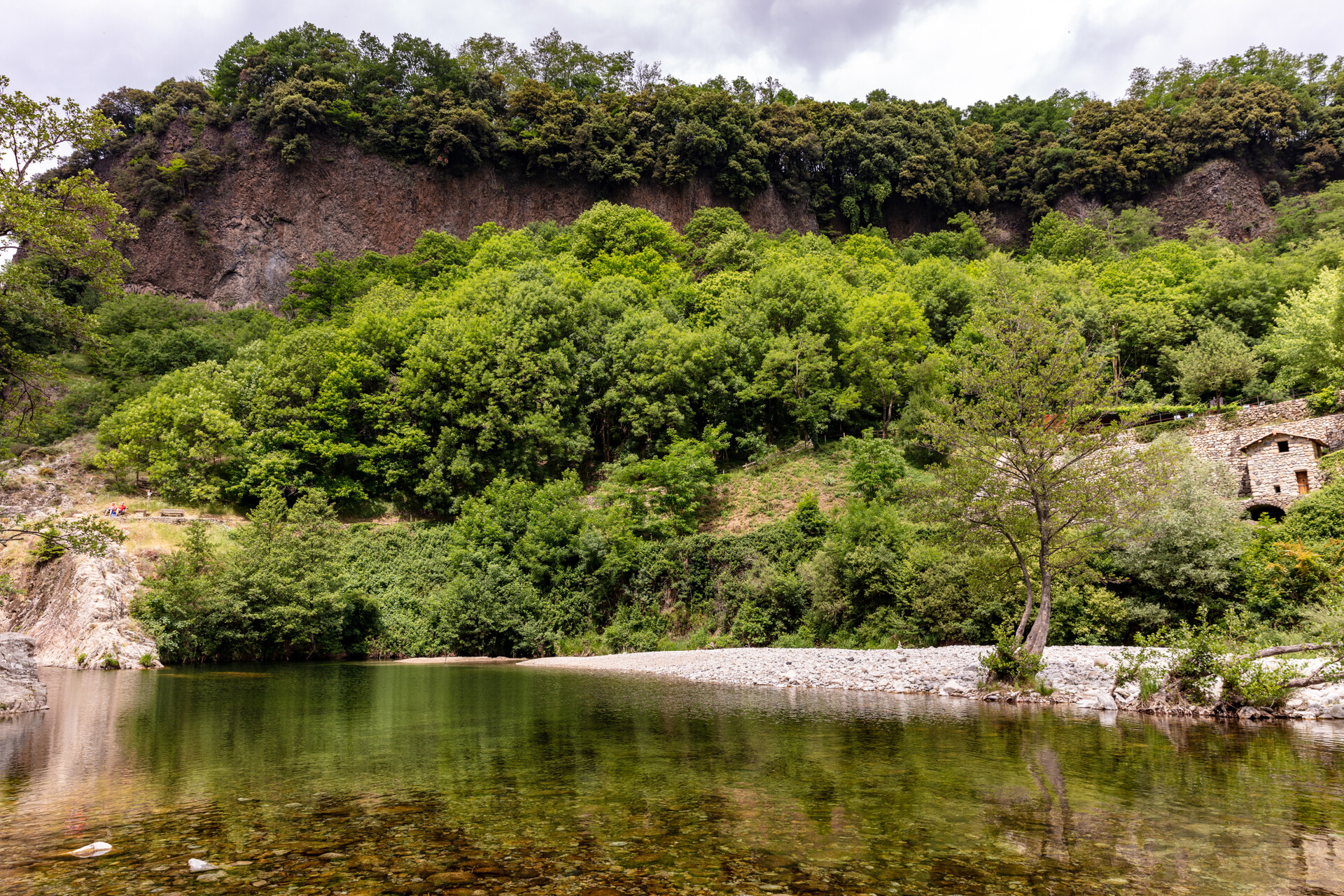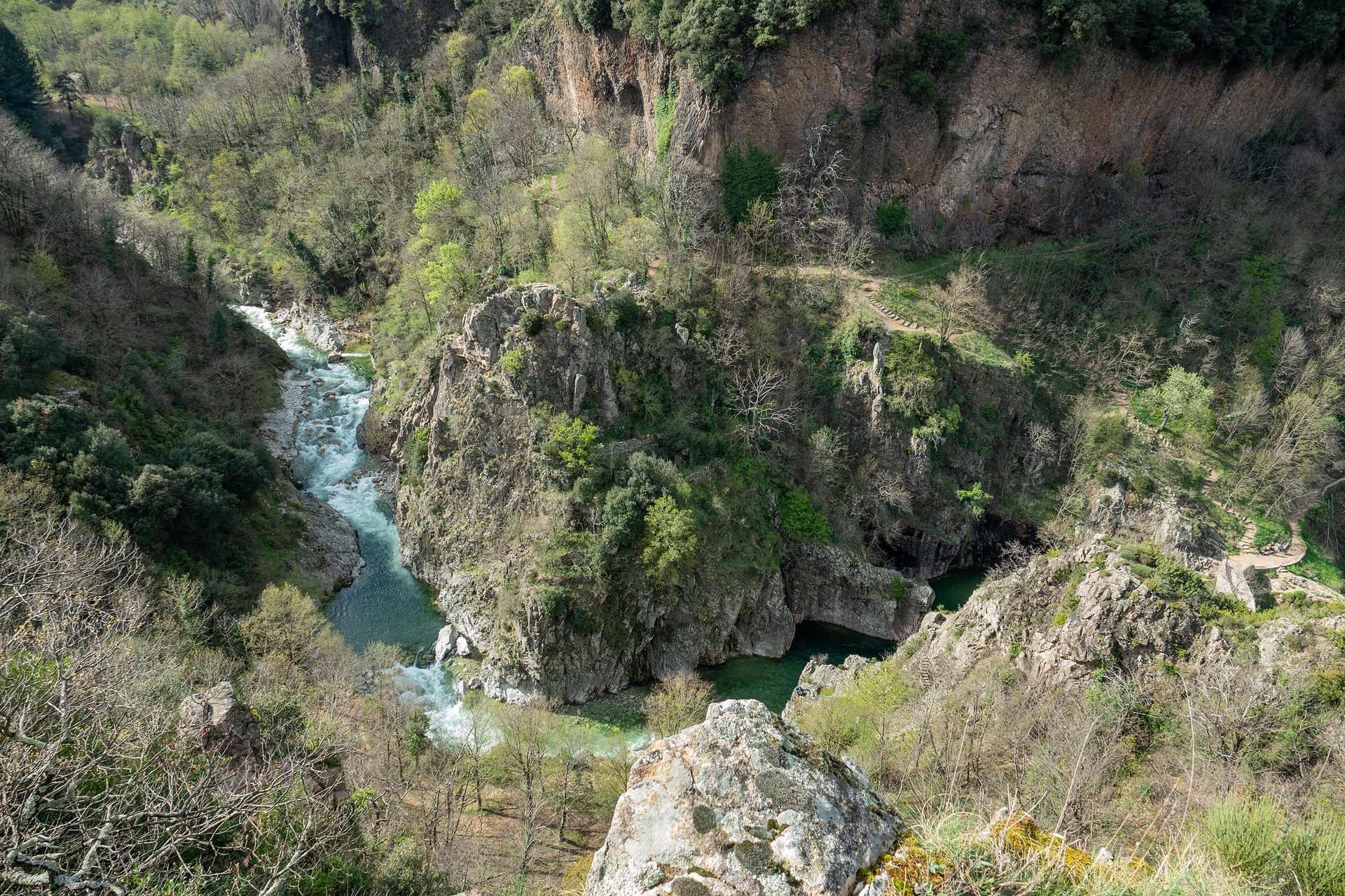 ② Juste avant le pont, prenez à gauche en direction de la via ferrata/ Pont du diable. Passez sous le pont et descendez la calade qui passe sous les orgues basaltiques.