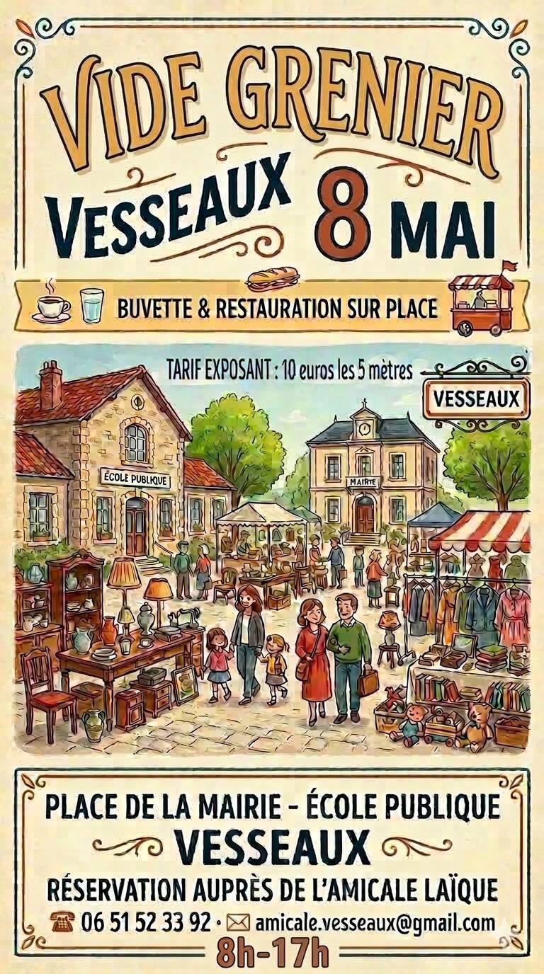 Vide-grenier annuel organisé par l'Amicale Laïque de l'école publique de Vesseaux. Buvette et petite restauration sur place. Réservé aux particuliers.