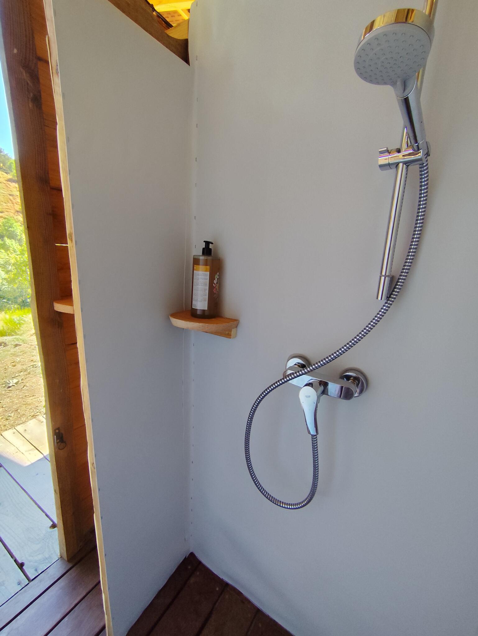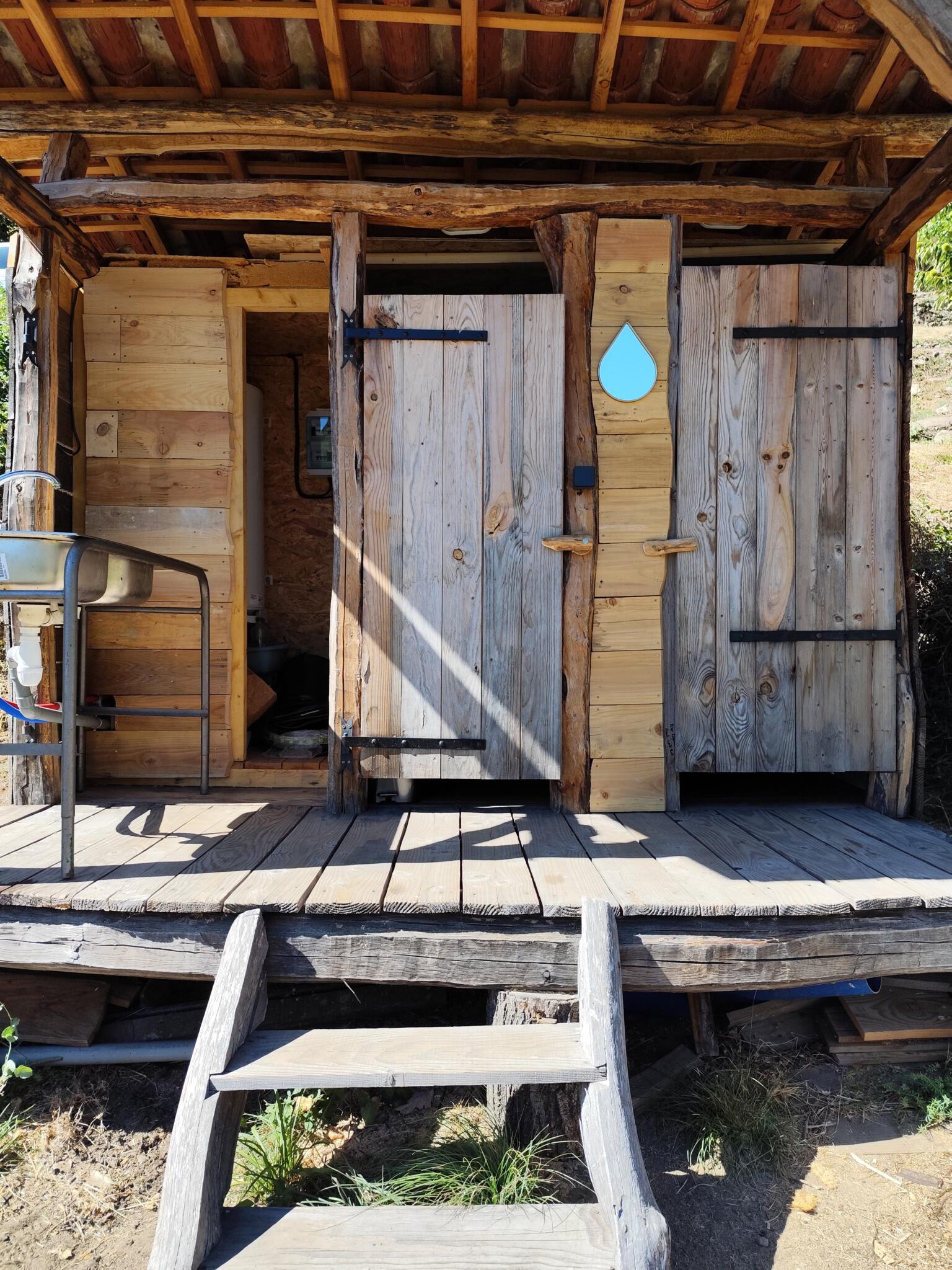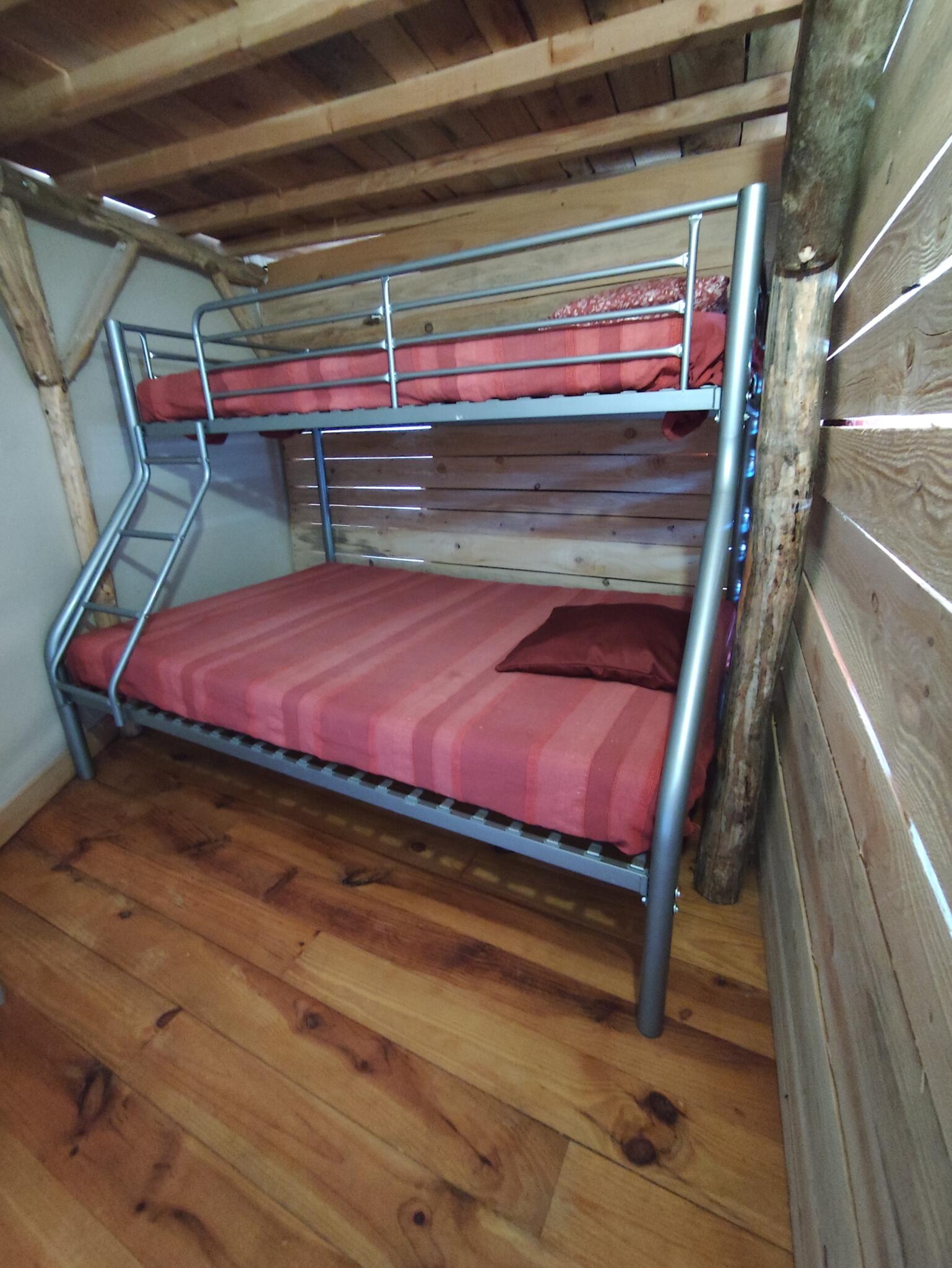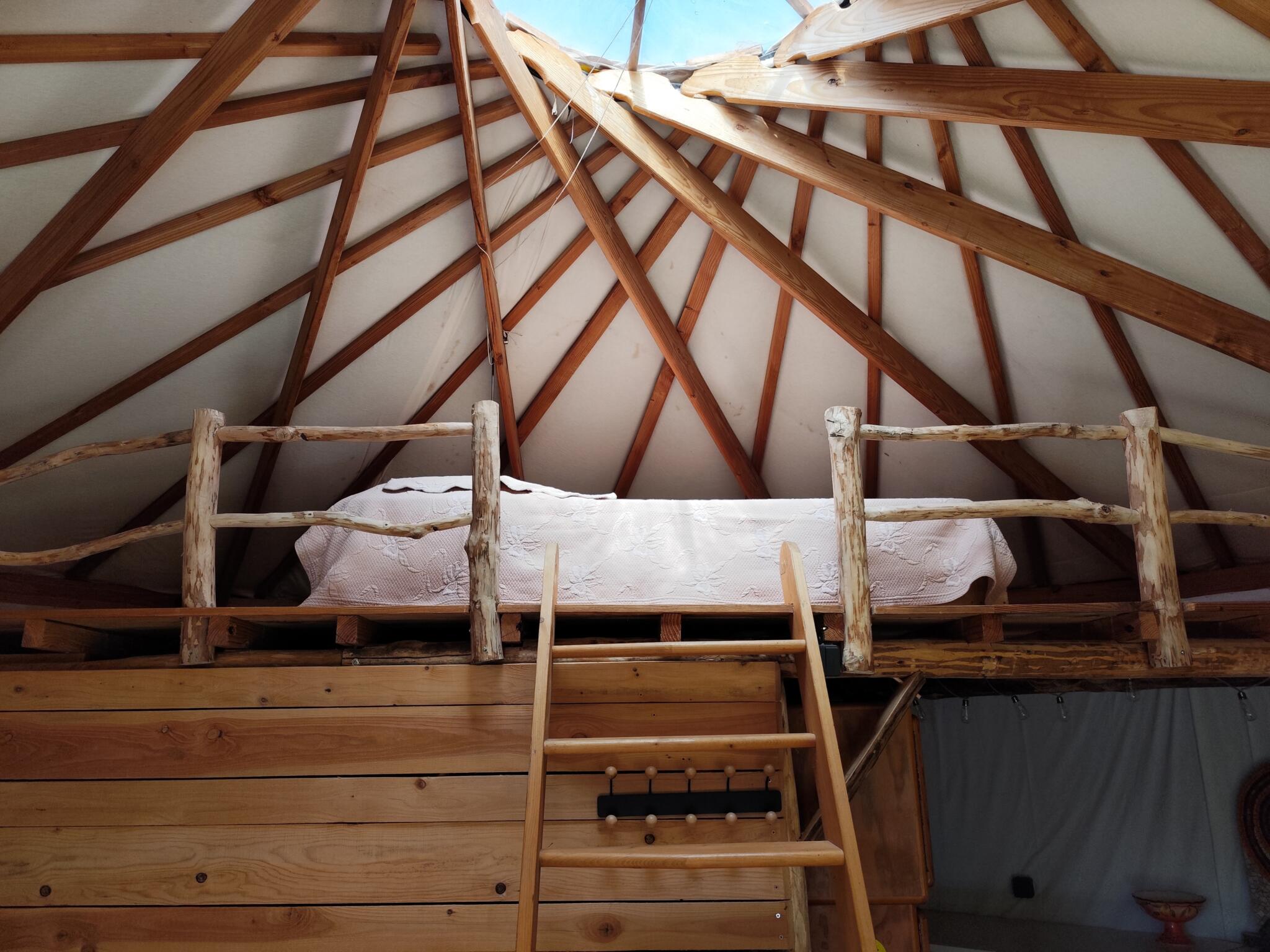 La Yourte de la Douceur est idéale pour un séjour à la mi-saison pour 2 à 4 personnes : une petite chambre avec un lit superposé, une mezzanine avec un lit double (plus un clic clac pour dépanner), un salon, une petite cuisine et une terrasse extérieure. Les sanitaires sont dans un cabanon en bois à quelques mêtres de la yourte : toilettes sèches, douche et évier plus grand.